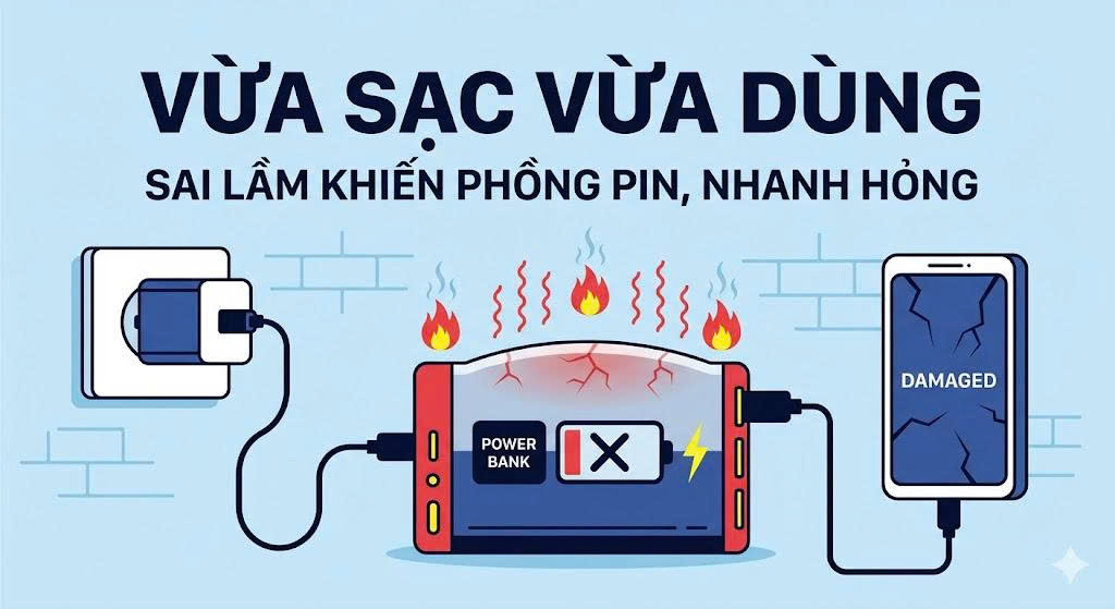 Nhiều người có thói quen cắm sạc dự phòng vào ổ điện, đồng thời cắm điện thoại vào sạc dự phòng để sạc cùng lúc. Mặc dù một số dòng sạc cao cấp có hỗ trợ tính năng này, nhưng việc duy trì thường xuyên sẽ khiến lõi pin (Cell pin) phải thực hiện quy trình nạp - xả liên tục. Điều này tạo ra nhiệt lượng cực lớn, dẫn đến tình trạng phồng pin và làm giảm dung lượng thực tế một cách nhanh chóng.