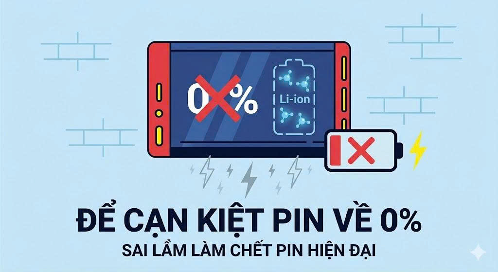 Đây là sai lầm kinh điển bắt nguồn từ thói quen sử dụng các dòng pin cũ thế hệ trước. Với pin Li-ion hoặc Li-Po hiện đại, việc để pin xuống mức 0% thường xuyên sẽ làm các ion lithium mất khả năng hoạt động, khiến pin bị "chết" hoặc khó kích nguồn trở lại.