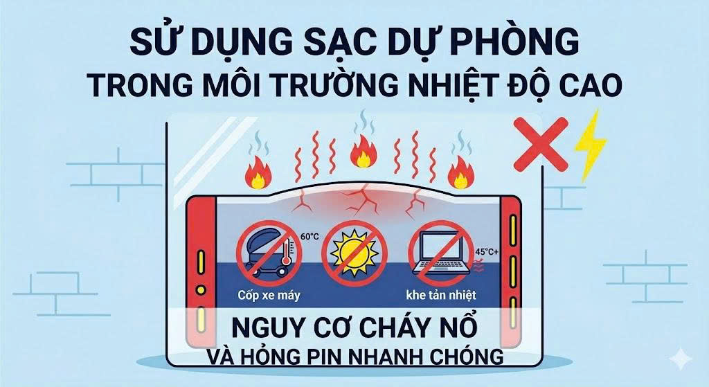Nhiệt độ là "kẻ thù số 1" của mọi thiết bị lưu trữ năng lượng. Sai lầm thường gặp nhất là để sạc dự phòng trong cốp xe máy, dưới ánh nắng trực tiếp hoặc gần khe tản nhiệt của laptop. Khi nhiệt độ vượt quá 45°C, các phản ứng hóa học bên trong pin sẽ bị rối loạn, tiềm ẩn nguy cơ cháy nổ cực kỳ nguy hiểm.