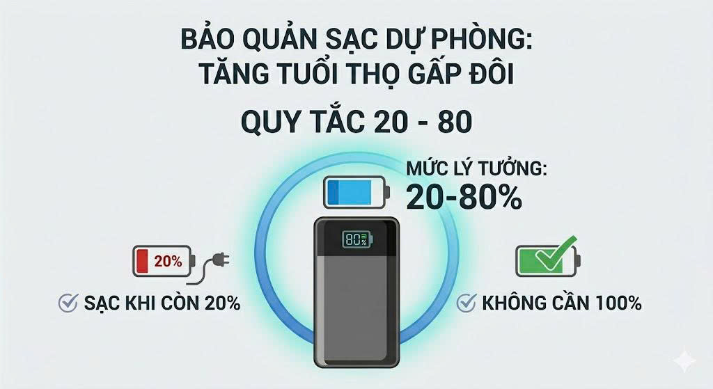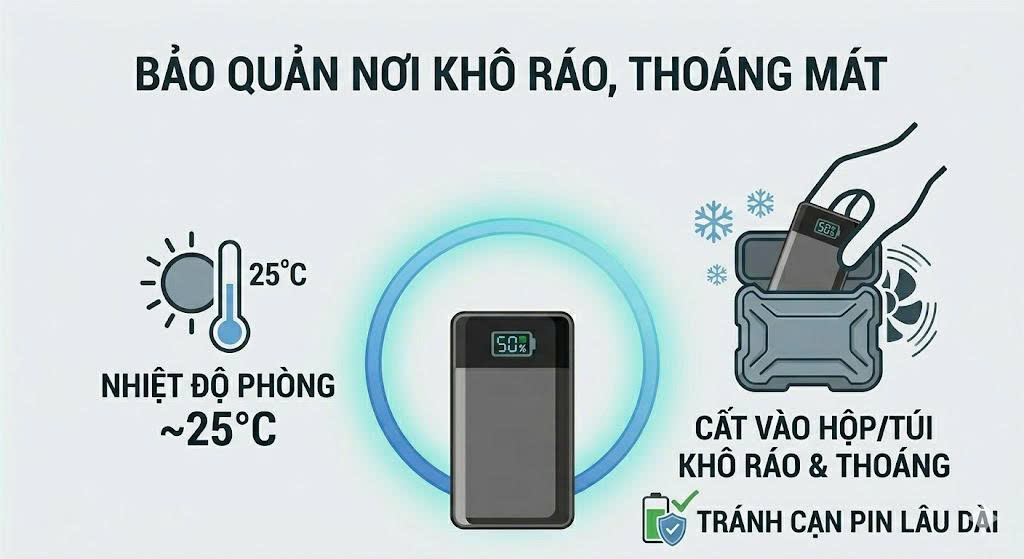 Luôn giữ sạc dự phòng ở nhiệt độ phòng (khoảng 25°C). Nếu không sử dụng trong thời gian dài, hãy sạc pin đạt mức khoảng 50% rồi cất vào hộp hoặc túi chống sốc, tránh để pin cạn kiệt hoàn toàn trong thời gian lưu kho.