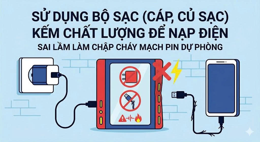 Sử dụng bộ sạc (cáp, củ sạc) kém chất lượng để nạp điện