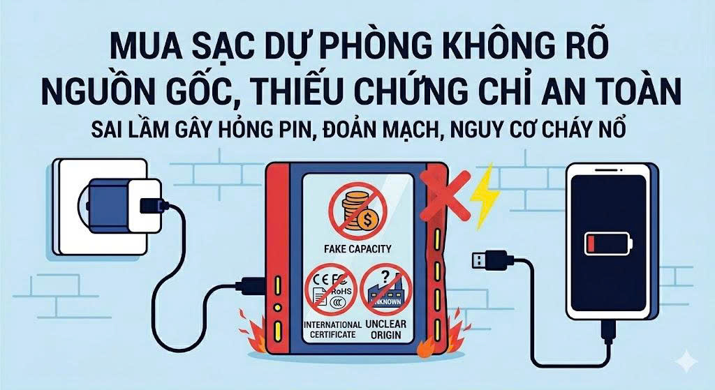 Mua sạc dự phòng không rõ nguồn gốc, thiếu chứng chỉ an toàn