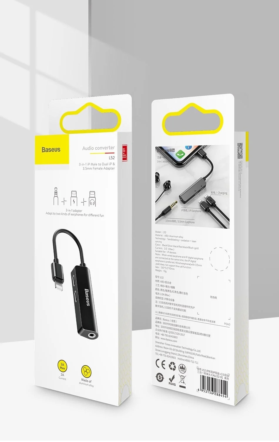 ⚡ Baseus L52 là phiên bản kết hợp và nâng cấp mới nhất của dòng L42 và LV37 – Giải pháp vừa nghe nhạc vừa sạc pin trên iPhone (chuyển đổi và mở rộng cổng Lightning ra thành 2 cổng Lightning và cổng Audio AUX 3.5mm) có hỗ trợ đàm thoại cổng Lightning.