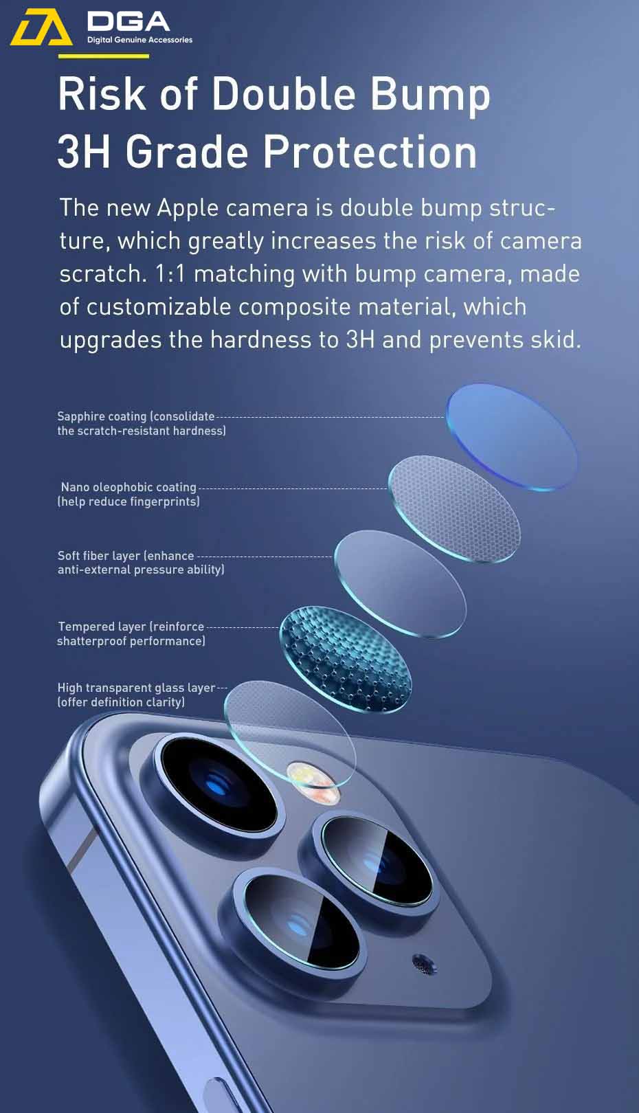 - Cấu tạo 5 lớp siêu bền, chống va đập, chống trầy xước camera cho iPhone. Chống bám nước / dầu / vân tay, chống nhòe. Bảo vệ camera cực tốt nhờ lớp ngoài cùng được phủ bằng Sapphire siêu cứng.
