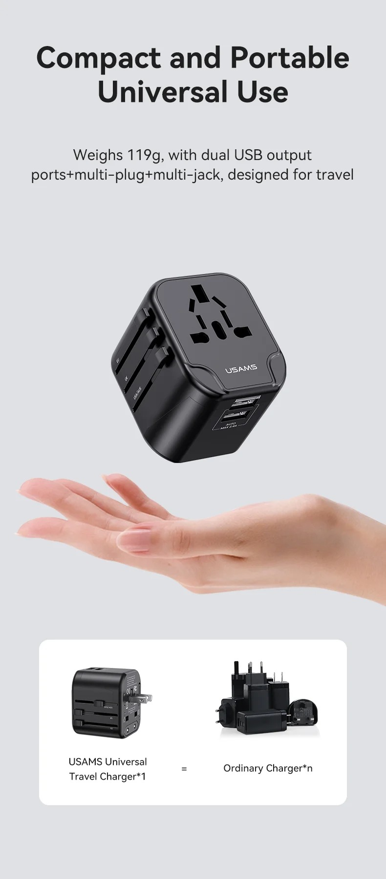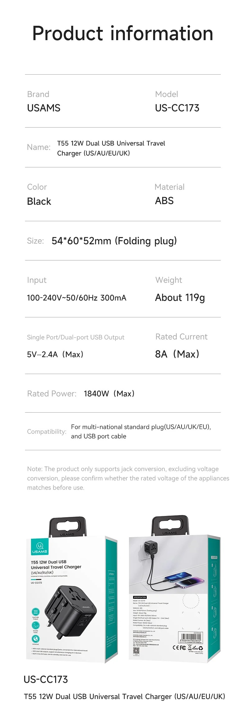 Bộ Sạc Du Lịch USAMS CC173 T55 12W được trang bị phích cắm đa năng, tương thích với các chuẩn phích cắm phổ biến trên thế giới như US, UK, EU và CN.