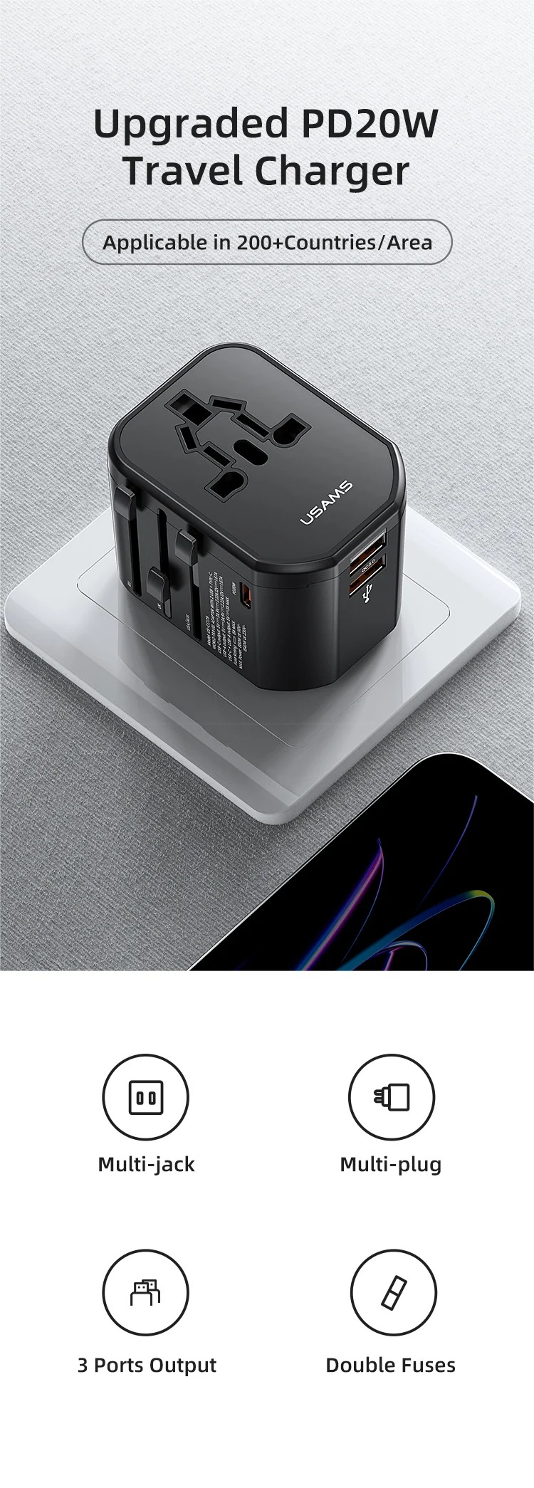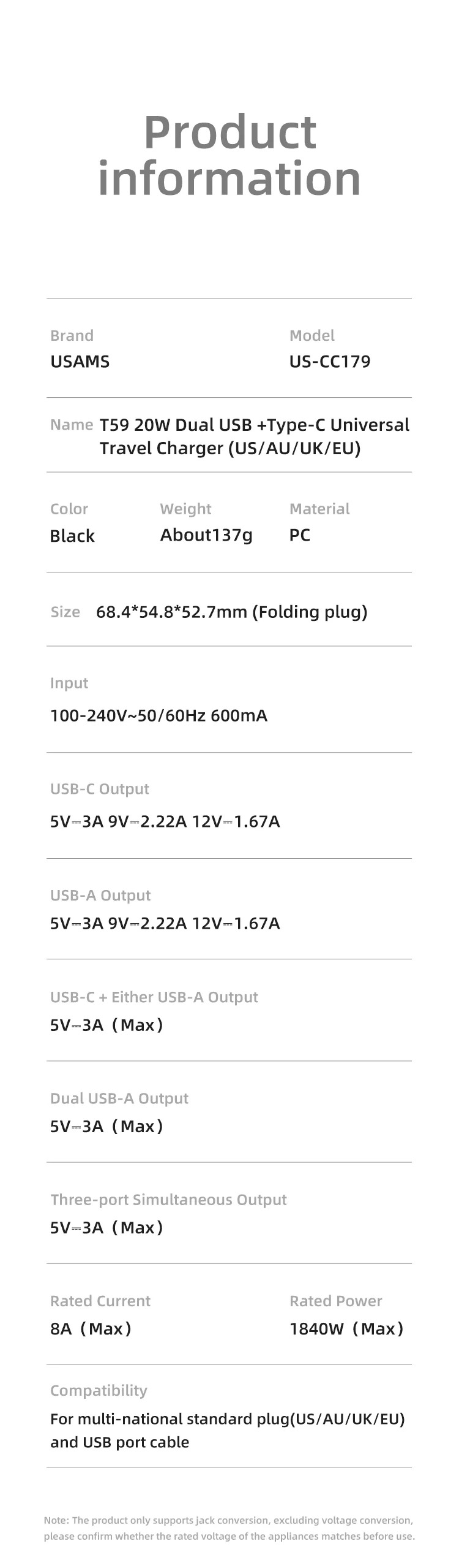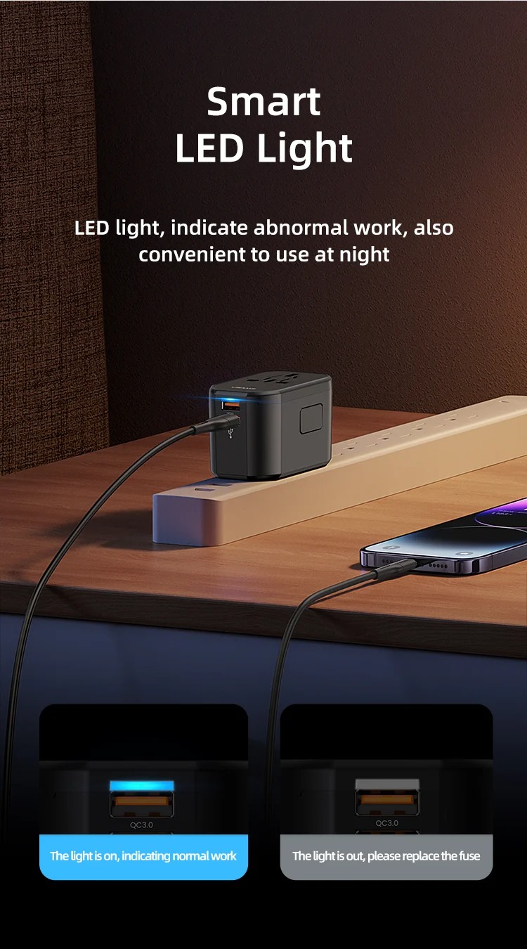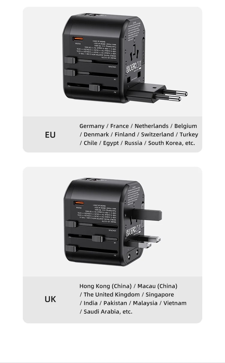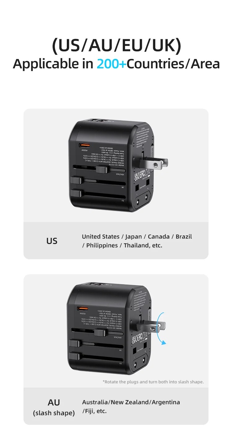 Điểm nổi bật nhất của USAMS US-CC179 T59 chính là khả năng tương thích với nhiều chuẩn cắm điện khác nhau trên thế giới.