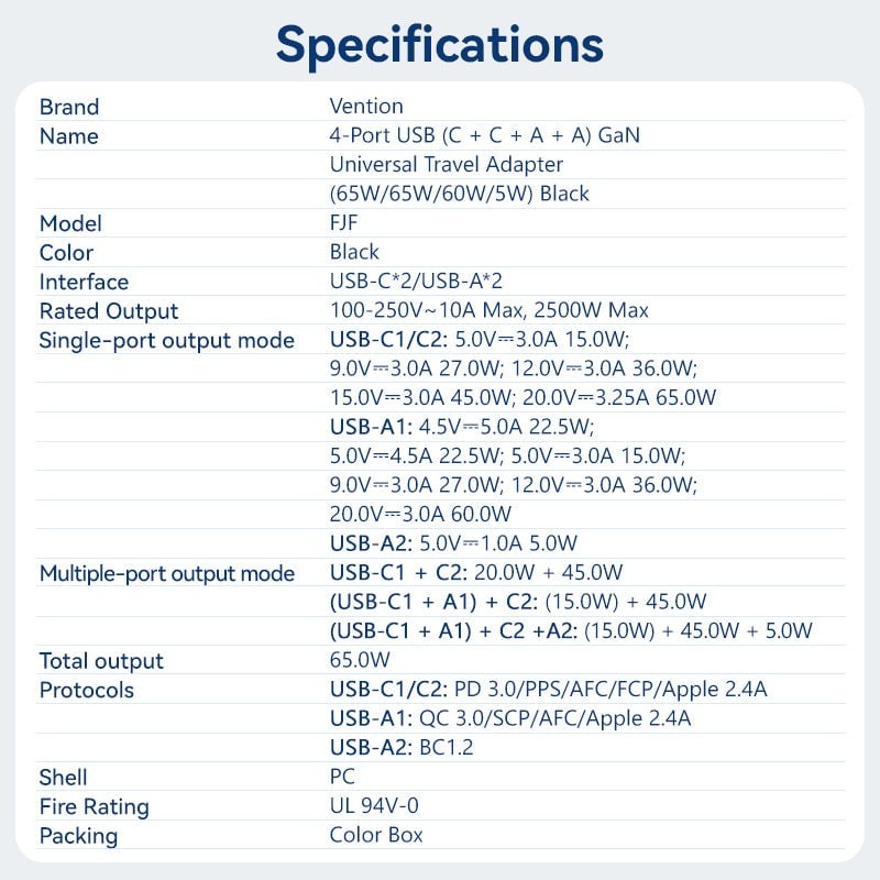 - Công suất cực đại: Mặc dù nhỏ gọn, bộ sạc Vention vẫn cung cấp công suất lên đến 100W, đủ sức sạc nhanh cho cả laptop.