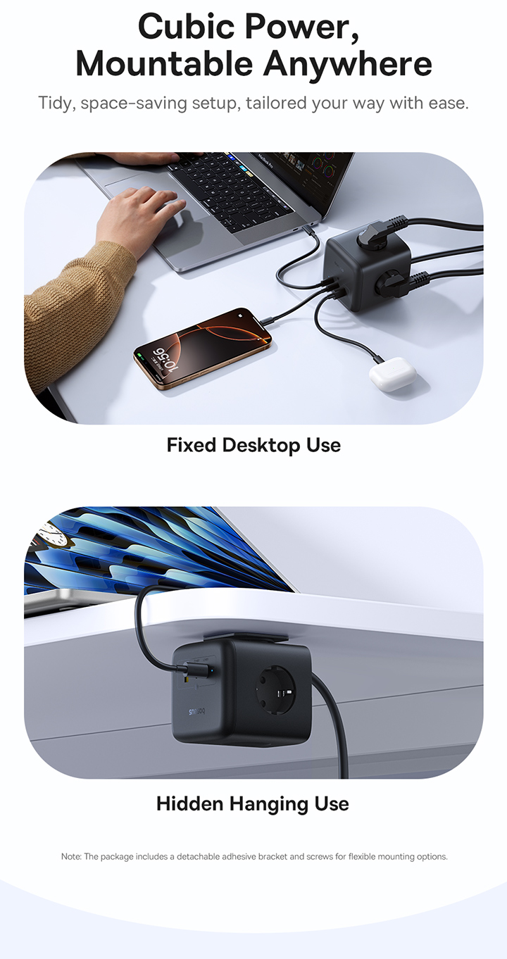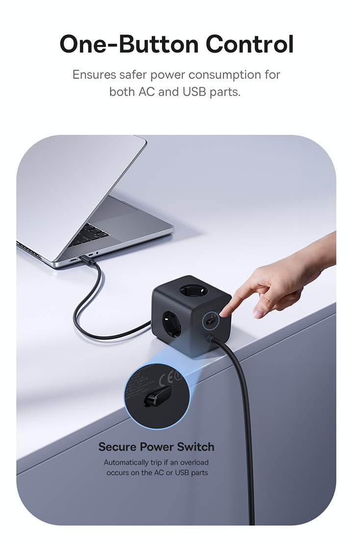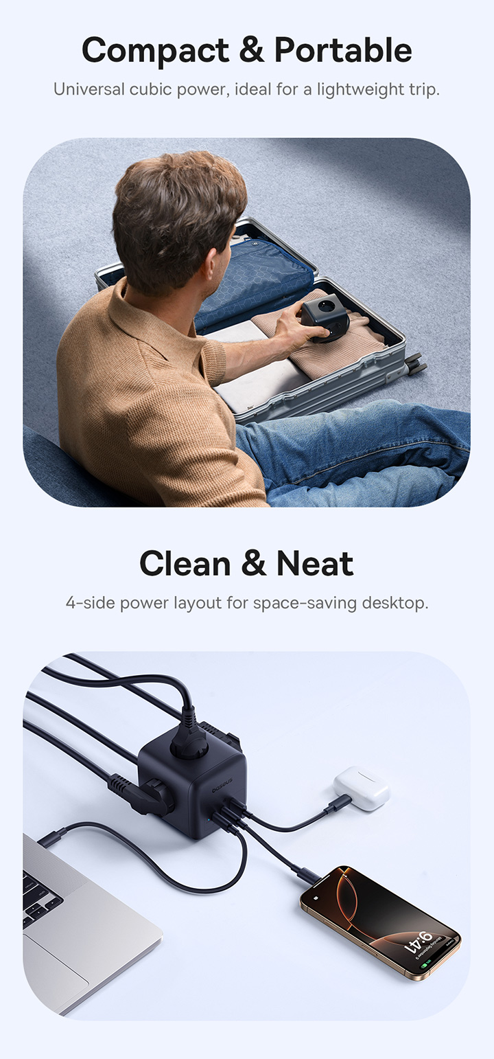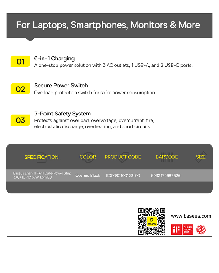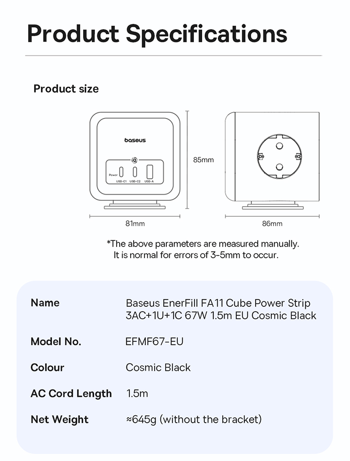 Bộ Sạc Nhanh 3AC+1U+1C Baseus EnerFill FA11 Cube Power Strip 67W (Tích Hợp Dây Nguồn Nối Dài 1.5m Chân EU)