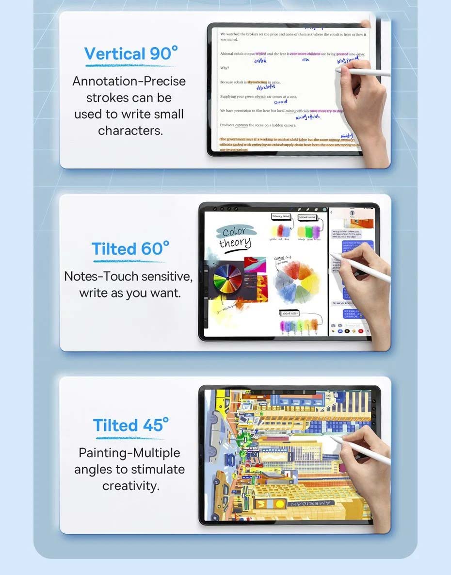 Baseus Pencil 2 được tích hợp công nghệ 4D. Qua đó, người dùng có thể điều chỉnh độ nhỏ lớn của từng nét vẽ theo ý muốn. Ví dụ, khi bạn viết nghiên ngòi bút thì sẽ được những nét mảnh. Còn khi viết thẳng thì sẽ được những nét đậm và trở nên nổi bật hơn. Giờ đây, bạn có thể dùng bút để vẽ vời, ghi chú, phác thảo, chỉnh sửa, chơi game và làm được nhiều việc hơn trên chiếc máy tính bảng iPad Pro thoải thích. Đồng thời, bạn cũng có thể sử dụng cùng lúc với một ngón tay để hỗ trợ thêm thao tác bất kỳ.