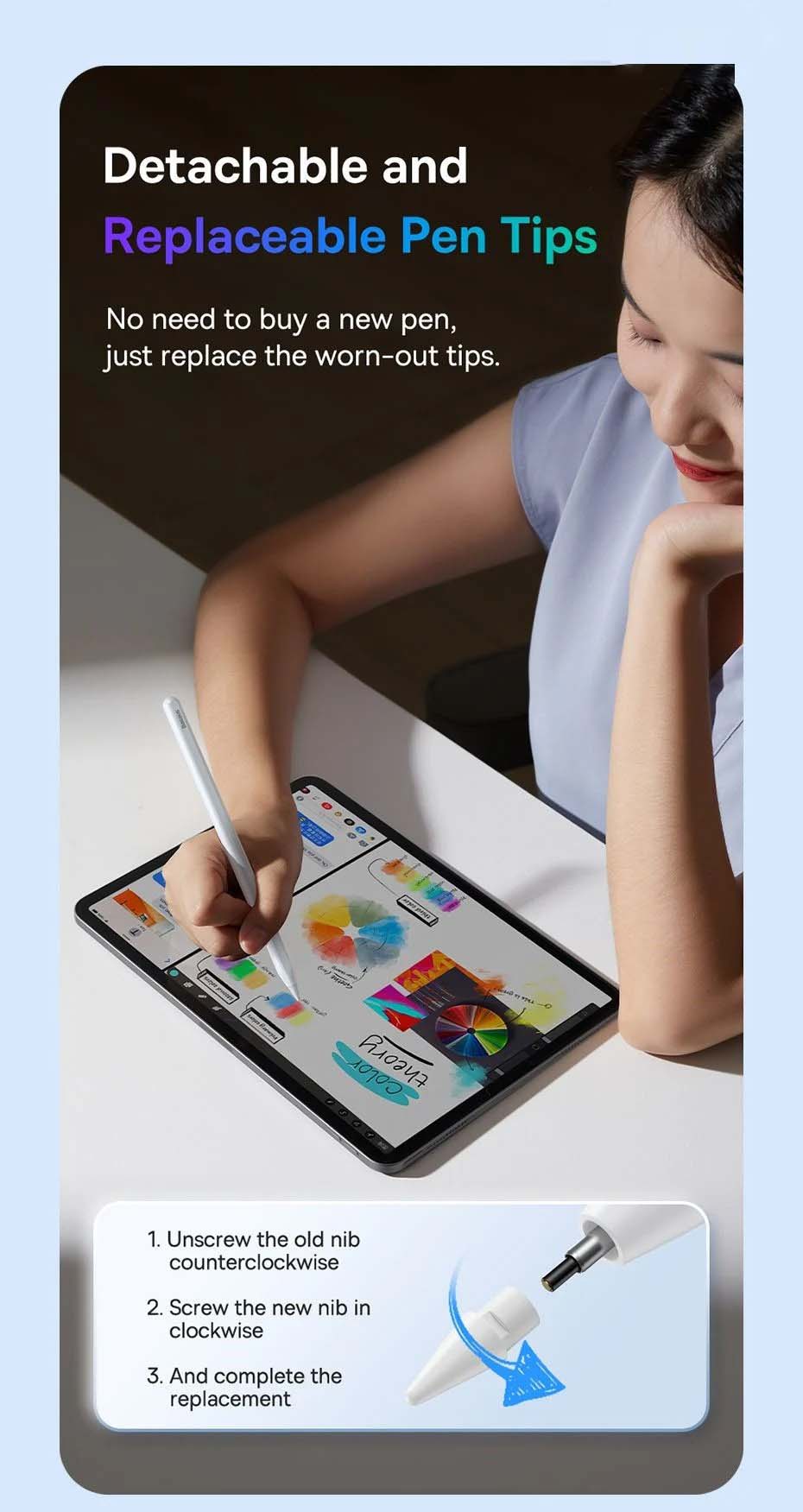 Một chiếc bút cảm ứng với ngòi bút nhỏ như bút thường, được trang bị các công nghệ hiện đại bậc nhất trên bút cảm ứng như khả năng phân biệt tay và ngòi bút, cảm biến độ nghiên và lực nhấn của ngòi bút ... giúp cho việc thao tác và phát hoạ trên iPad được thuận tiện, linh hoạt và dễ dàng hơn đáng kể so với việc sử dụng bằng tay. Bút cảm ứng Baseus Pencil mang đến một sức mạnh vượt trội cho iPad củng như các Smaprtphone/ Tablet Android