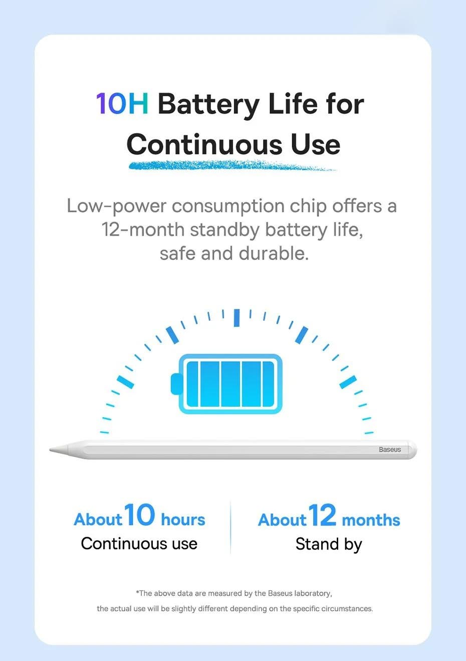 Cụ thể pin Baseus Pencil cho thời gian sử dụng lên tới 10h liên tục và thời gian chờ lên đến 12 tháng, an toàn và bền theo thời gian