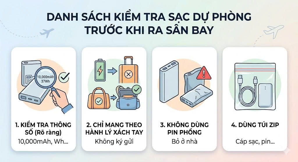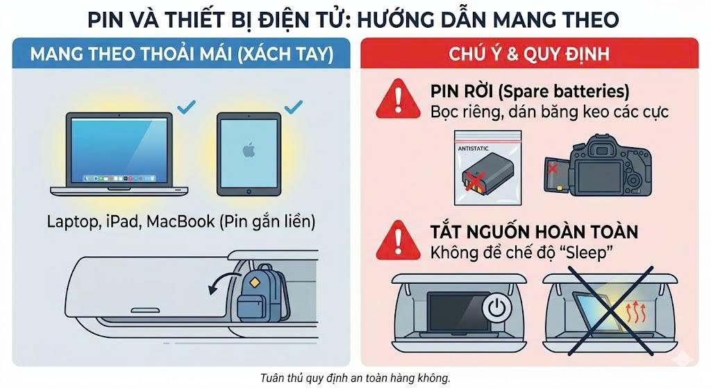 Tuyệt đối không ký gửi: Mọi thứ liên quan đến pin Lithium phải nằm trong hành lý xách tay.