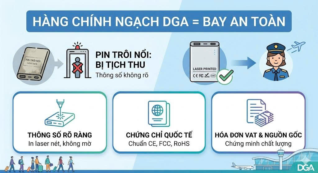 Việc thắt chặt quy định hàng không năm 2026 không nhằm gây khó dễ cho hành khách, mà để đảm bảo an toàn tối đa cho mỗi chuyến bay. Bằng cách chọn mua những sản phẩm chính ngạch, minh bạch thuế và pháp lý tại DGA Store, bạn không chỉ sở hữu một thiết bị sạc nhanh, bền bỉ mà còn sở hữu sự an tâm tuyệt đối trên mỗi hành trình.