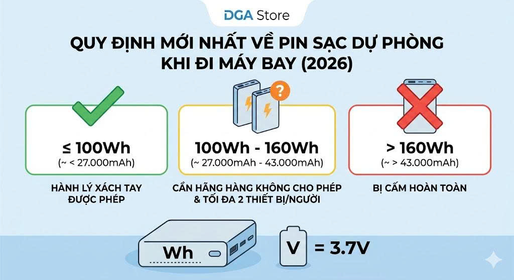 Dưới 100Wh (Khoảng dưới 27.000mAh): Được phép mang theo trong hành lý xách tay mà không cần xin phép. Đây là vùng an toàn nhất cho các dòng pin 10.000mAh và 20.000mAh đang bán tại DGA.