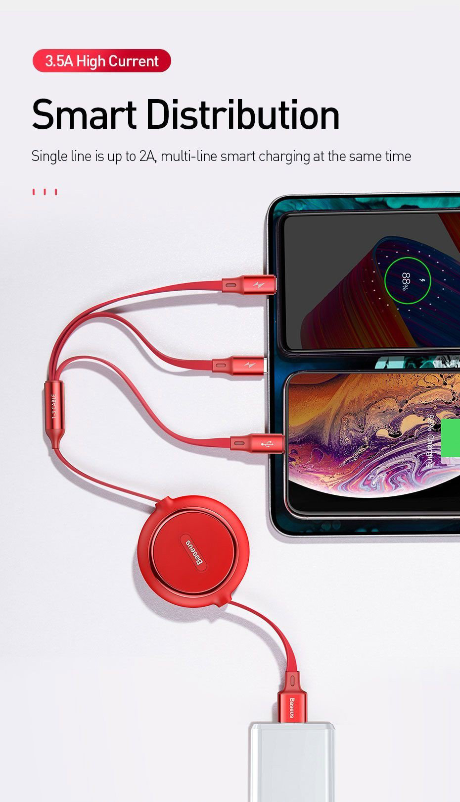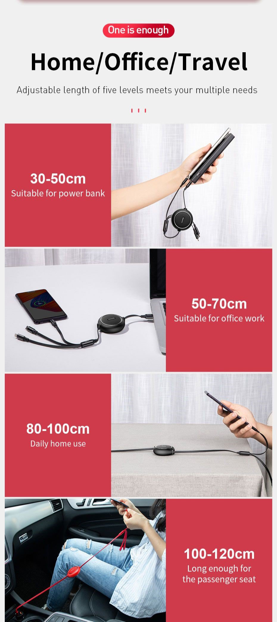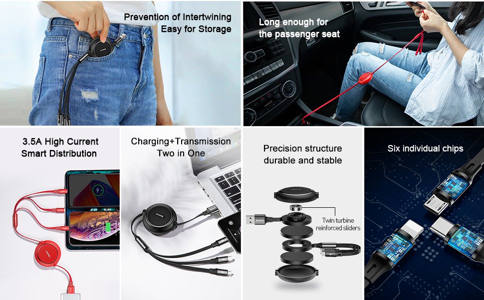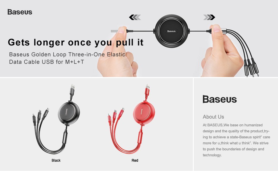 ⚡ Thiết kế tiện dụng với 3 đầu kết nối rời nhau giúp cho bạn có hteer kết nối cùng lúc 3 thiết bị dễ dàng hơn . Dây cáp dẹp chống rối dây có chiều dài lên đến 120 cm, có 5 mức (35cm, 60cm, 80cm, 110cm và 120cm) . Có thể rút gọn dễ dàng khi không sử dụng ⚡