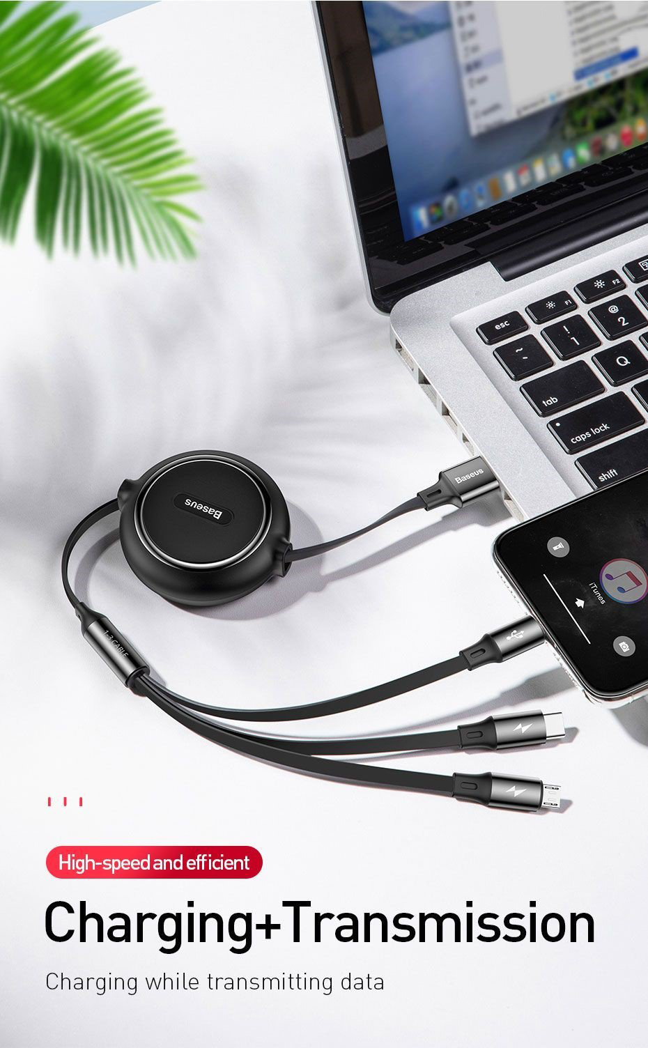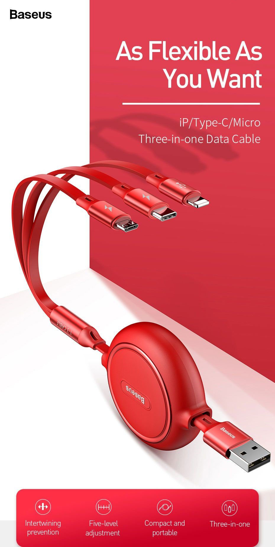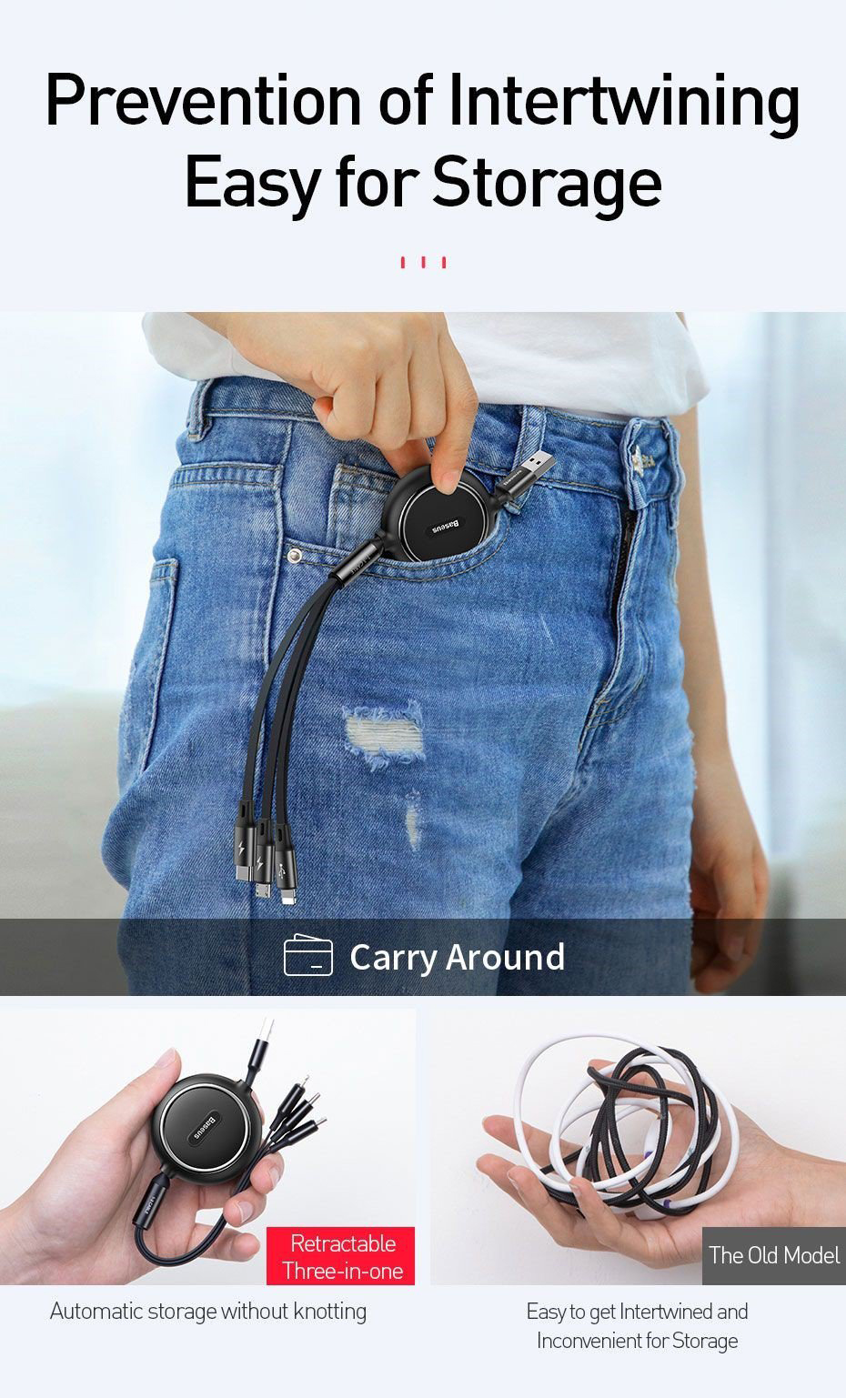 ⚡ Thiết kế tiện dụng với 3 đầu kết nối rời nhau giúp cho bạn có hteer kết nối cùng lúc 3 thiết bị dễ dàng hơn . Dây cáp dẹp chống rối dây có chiều dài lên đến 120 cm, có 5 mức (35cm, 60cm, 80cm, 110cm và 120cm) . Có thể rút gọn dễ dàng khi không sử dụng ⚡