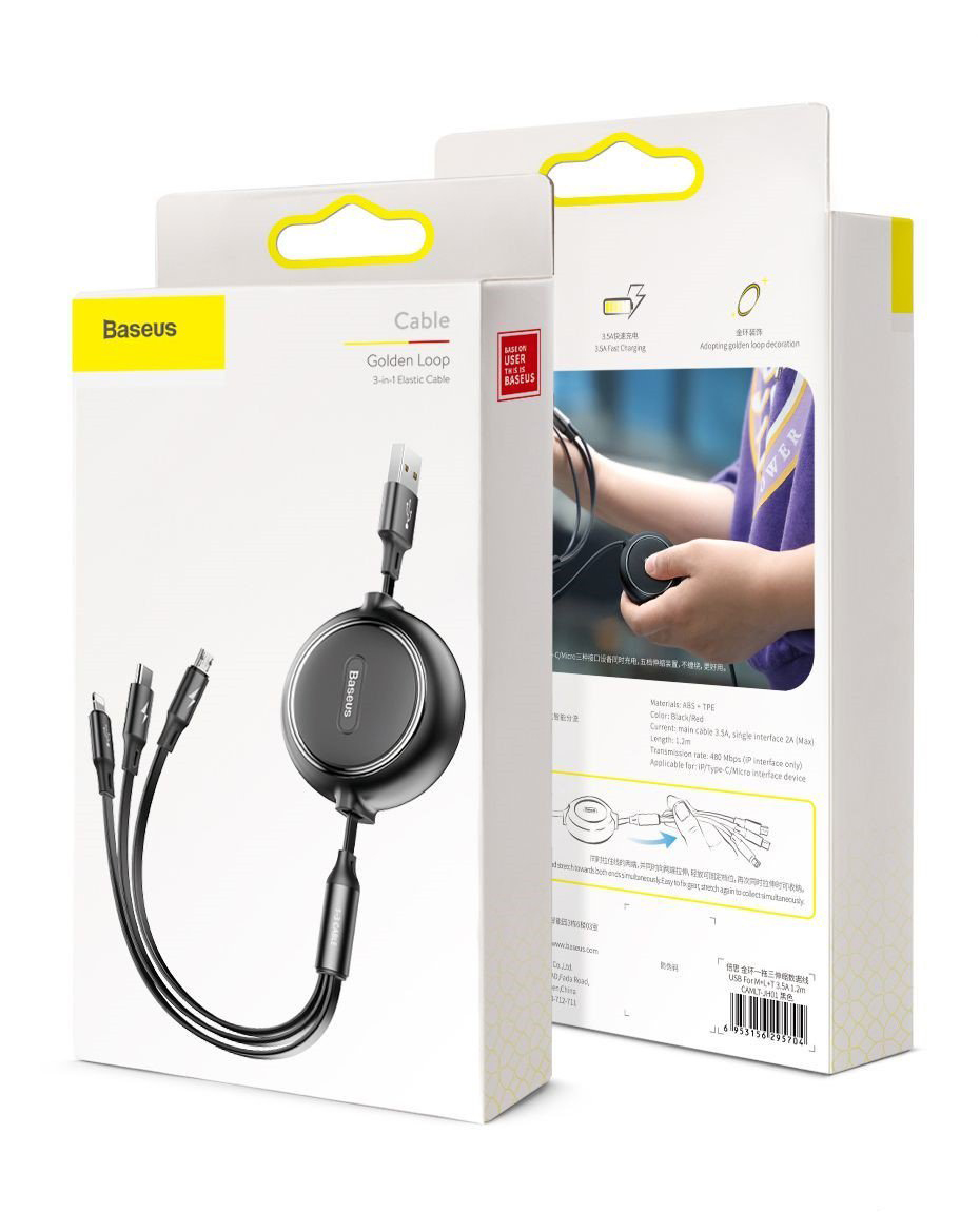 Cáp sạc dây rút 3 đầu Baseus Golden Loop 3 in 1 Elastic (3.5A, Type C/ Lightning/ Micro USB, Adjustable, Data & Fast Charge Cable) tương thích các loại điện thoại Iphone, Samsung, Vivo, ….