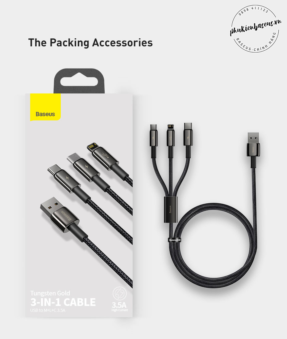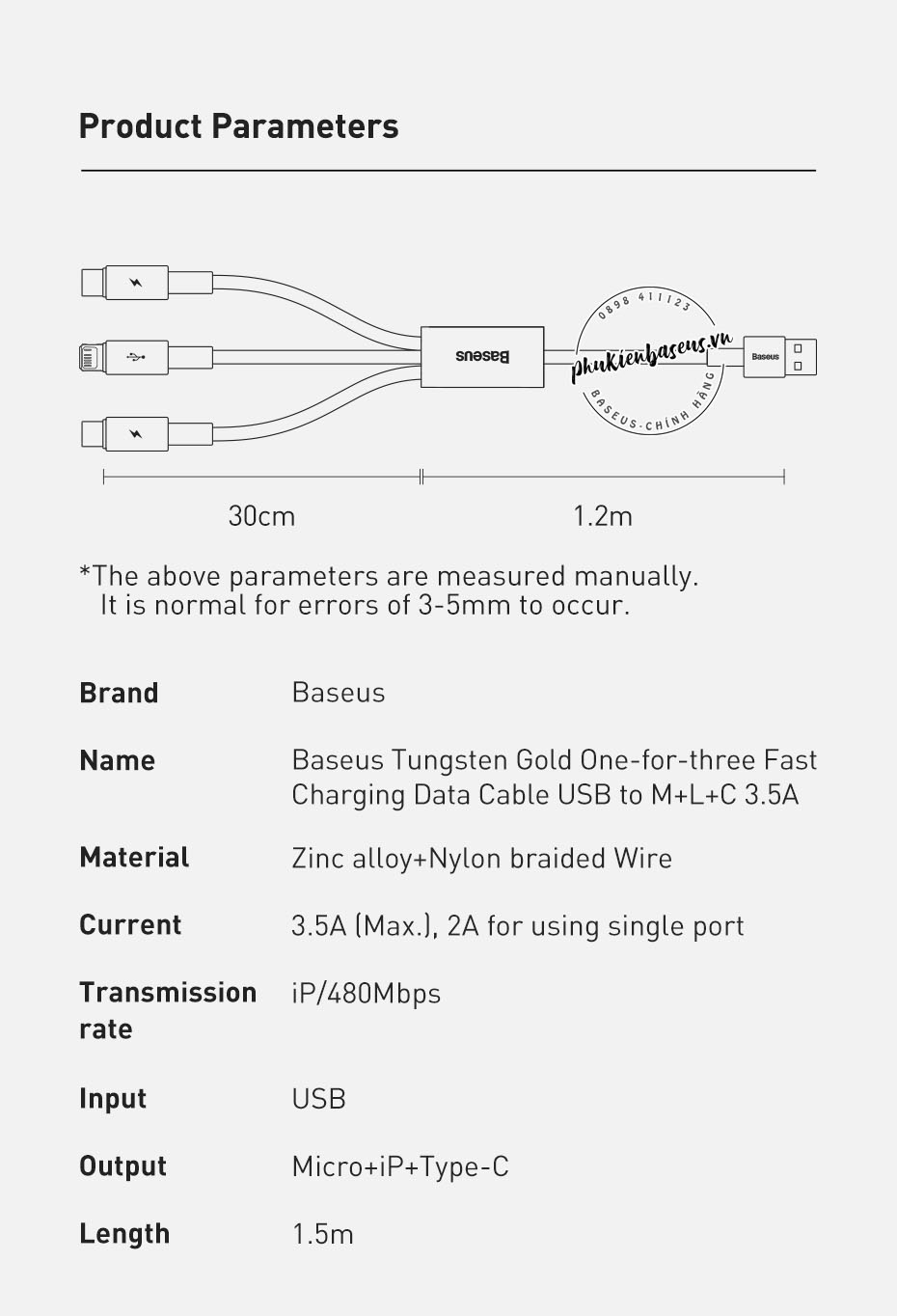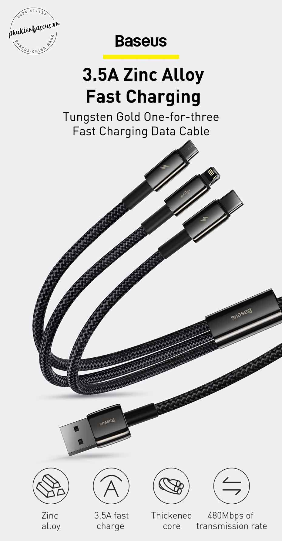 Thông số kỹ thuật Cáp sạc 3 đầu siêu bền Baseus Tungsten Gold Series 3in1 (USB to Type C/ Lightning/ Micro USB, 3.5A Fast Charging & Data Cable )