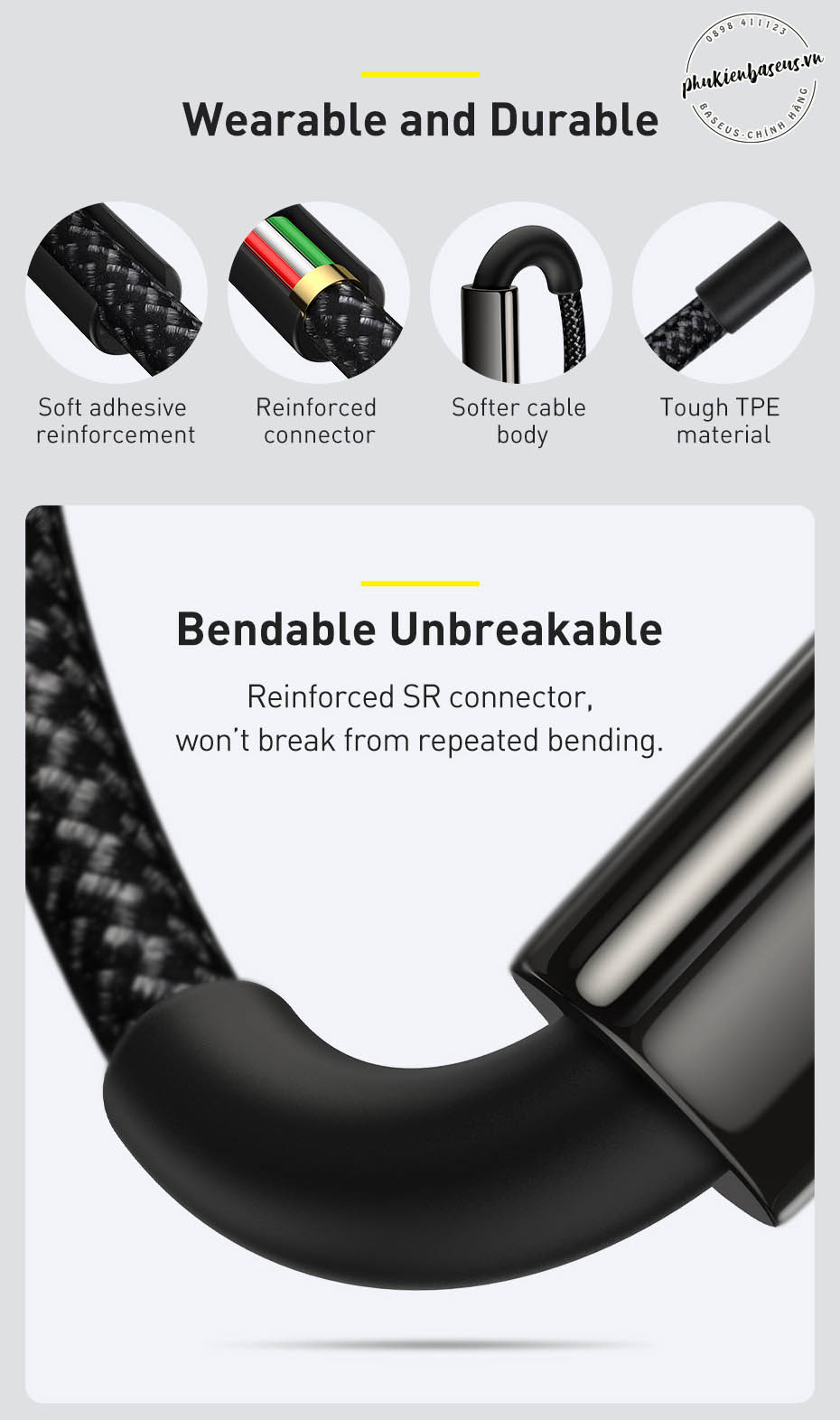 – Dây cáp với phần lõi được trang bị lên đến 6 lõi đồng giúp ổn định công suất khi sạc cũng như khi truyền data. Bên ngoài được bọc vải dù chất lượng cao siêu bền và linh hoạt giúp giảm tỉ lệ đứt gãy. Cảm giác cầm trên tay và khi sử dụng được thoải mái hơn, thời gian sử dụng được lâu hơn.
