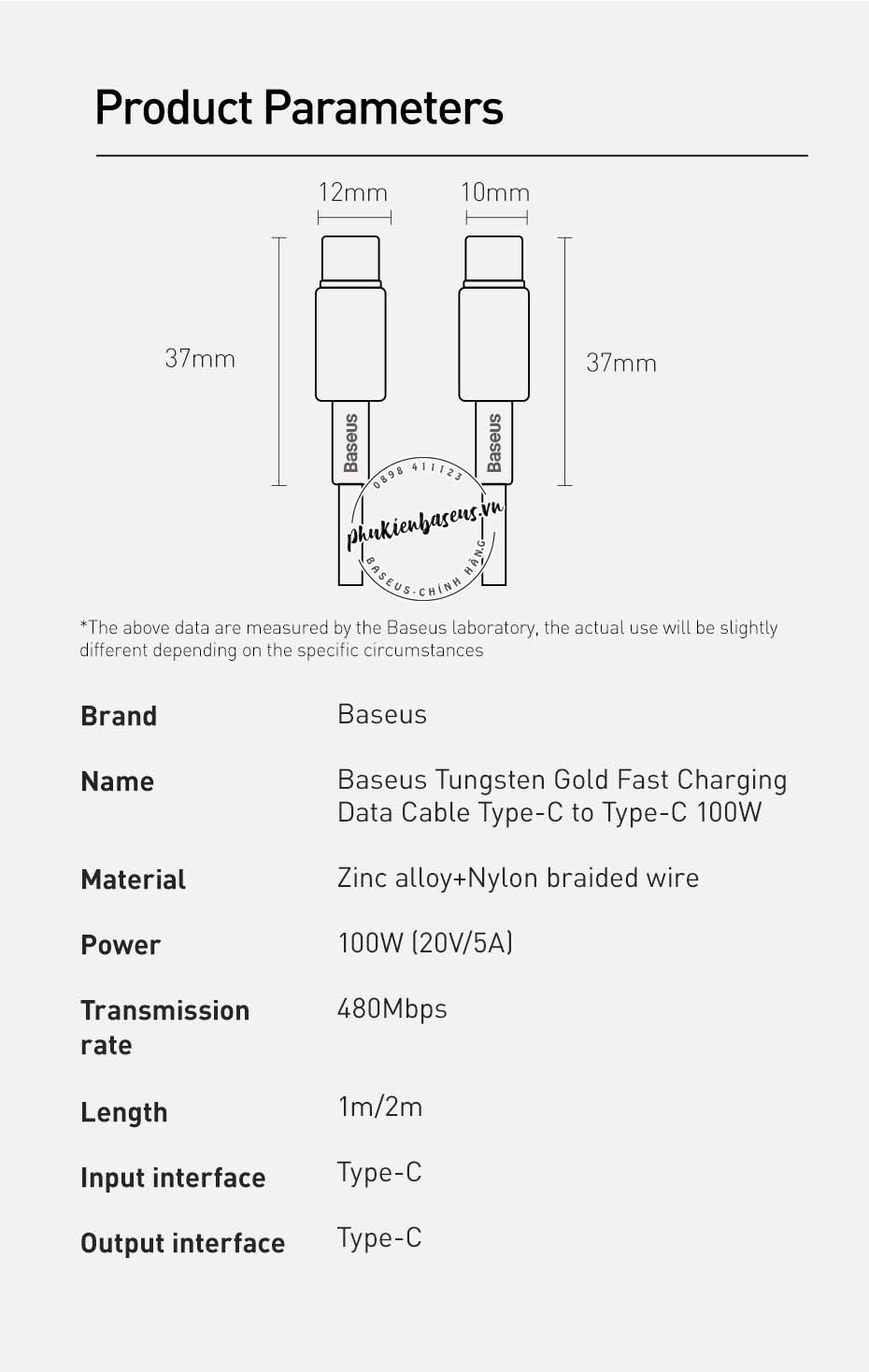 Thông số kỹ thuật Cáp sạc nhanh và truyền dữ liệu Baseus Tungsten Gold Fast Charging Data Cable (100W)