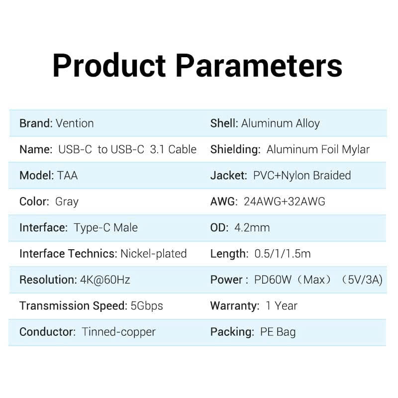 Tính năng Cáp Sạc Nhanh VENTION USB 3.1 C to C TAAHF (3A/60W, 4K, Cotton Braided)