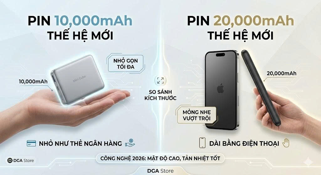 Pin 10.000mAh: Hiện nay có những dòng chỉ nhỏ bằng một chiếc thẻ ngân hàng hoặc "mini cube" nằm gọn trong lòng bàn tay.