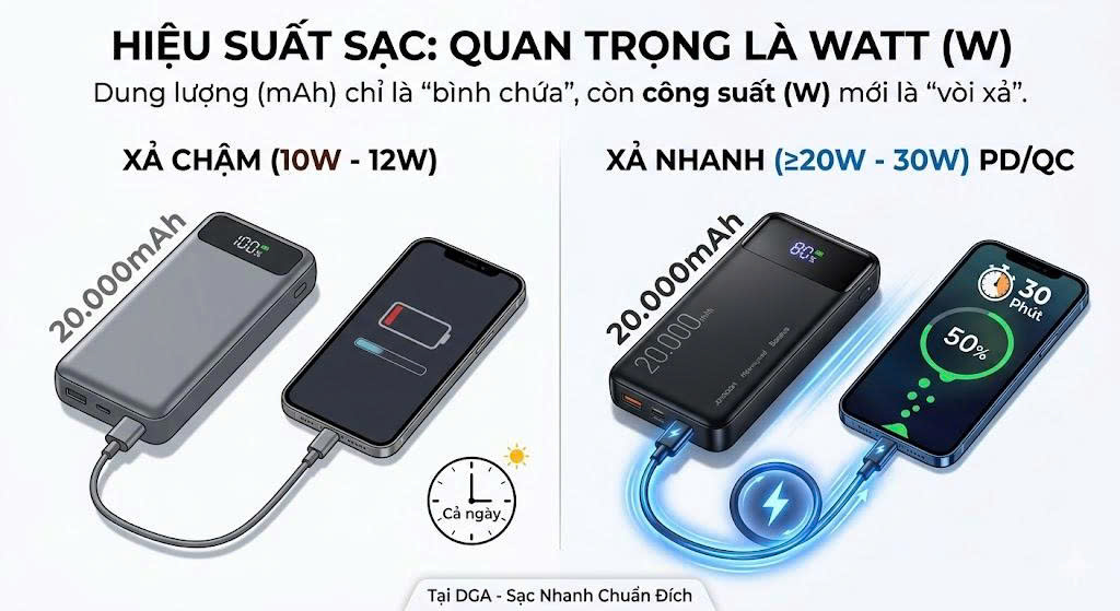 Dung lượng (mAh) chỉ là "bình chứa", còn công suất (W) mới là "vòi xả".