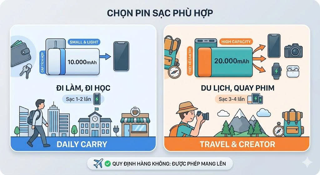 Chọn 10.000mAh nếu bạn ưu tiên sự nhẹ nhàng, tinh tế và chỉ dùng để sạc "chữa cháy" hàng ngày.