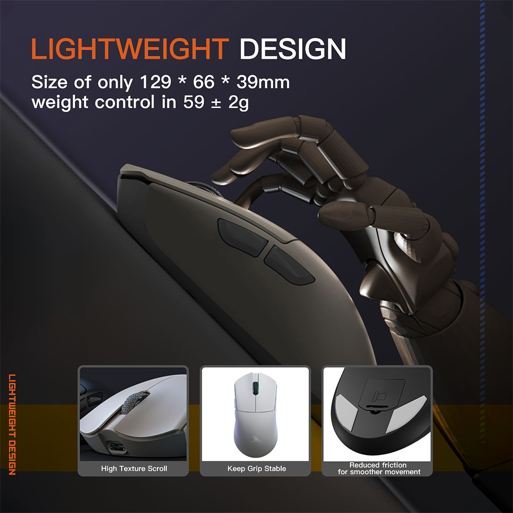 Chuột Darmoshark M3 được thiết kế theo trường phái tối giản với 3 lựa chọn màu trung tính: trắng, đen và camel. Trọng lượng 58gram nhỏ gọn tinh tế, dáng chuột đối xứng công thái học ôm trọn lòng bàn tay giúp bạn thoải mái thao tác. Phần vỏ ngoài chế tác từ nhựa ABS cao cấp với độ chống chịu cực tốt chẳng ngại va đập.