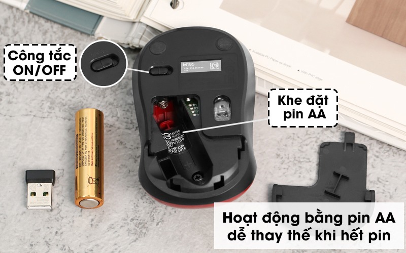Chuột không dây Logitech M185 hoạt động bằng pin AA thông dụng, mua và thay thế tiện lợi