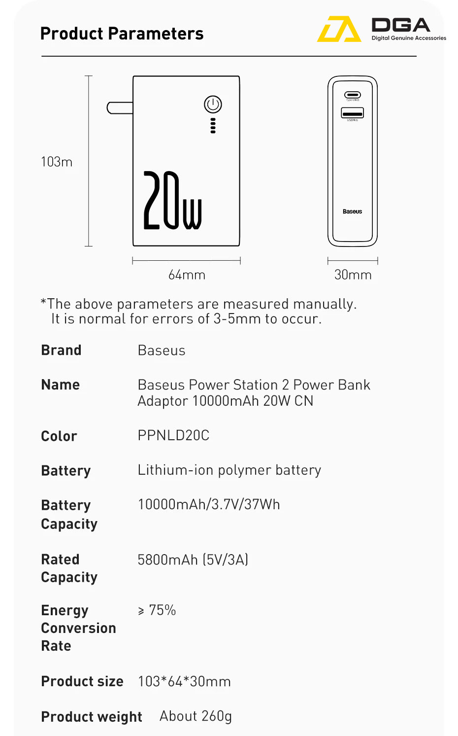 Thông tin chi tiết Cóc sạc nhanh kiêm pin sạc dự phòng Baseus Power Station 20W 2 in 1 PD/QC3.0 (10000mAh , Type C/USB Quick Charge,Travel Charger & Powerbank )