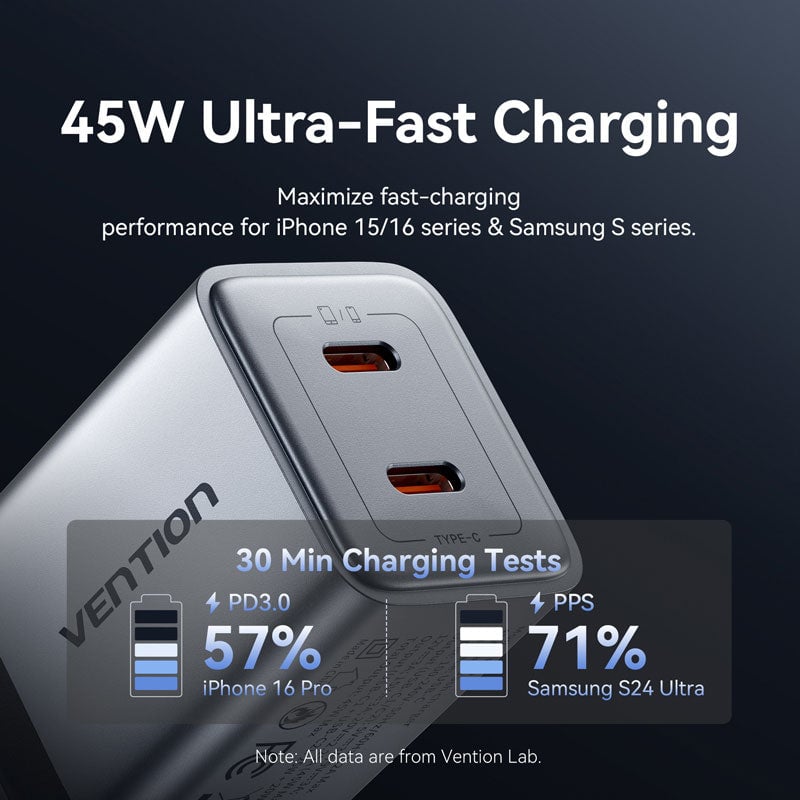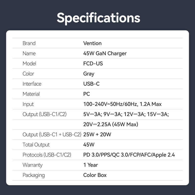 Output (USB-C1/C2): 5V-3A; 9V-3A; 12V-3A; 15V-3A; 20V-2.25A (45W Max)