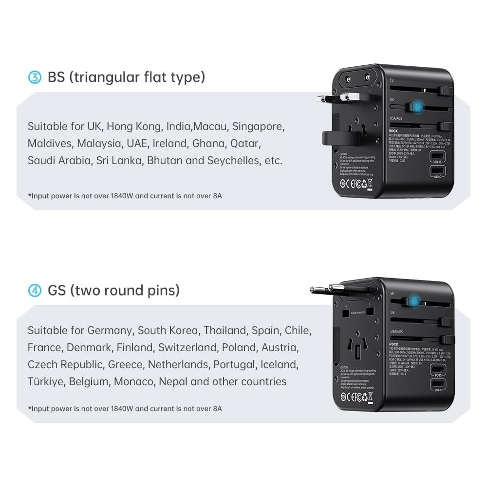 TÍNH NĂNG CỦ SẠC NHANH ĐA NĂNG DU LỊCH TOÀN CẦU ROCK T62 MULTIFUNCTIONAL WORLD TRAVEL PD FAST CHARGER