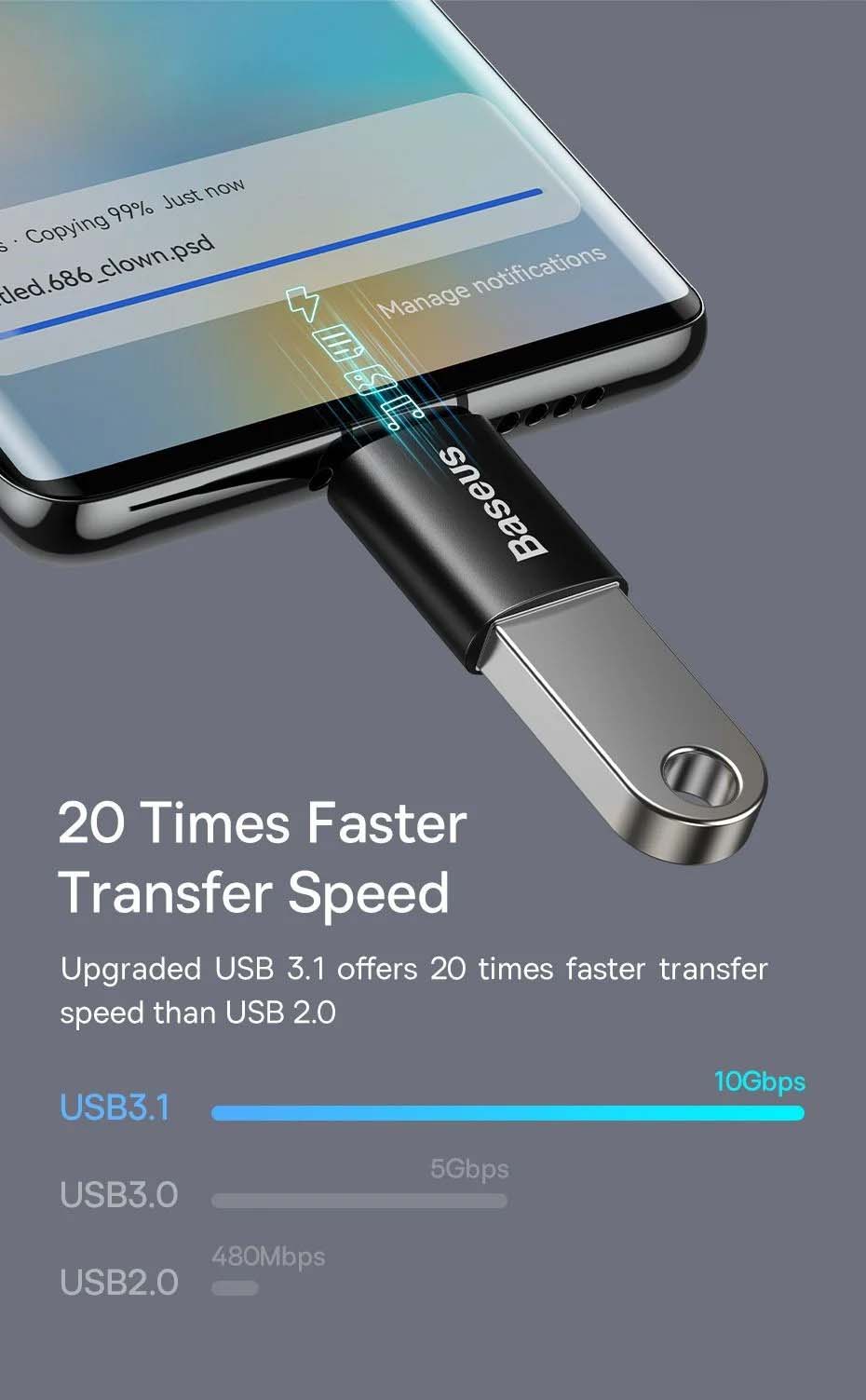 - Đầu chuyển OTG Type C to USB 3.1 tốc độ cao Baseus Ingenuity Series Mini OTG Gen2 với sự nâng cấp đáng kể về tốc độ Sync data , sản phẩm hỗ trợ USB 3.1 với tốc độ truyền data lên đến 10Gbps , đồng thời củng tương thích tốt với các chuẩn USB 3.0 và USB 2.0 . Tương thích với hầu hết các thiết bị số từ Laptop/Macbook , Tablet/ iPad Pro cho đến Smartphone và các thiết bị di động dùng cổng type C khác .