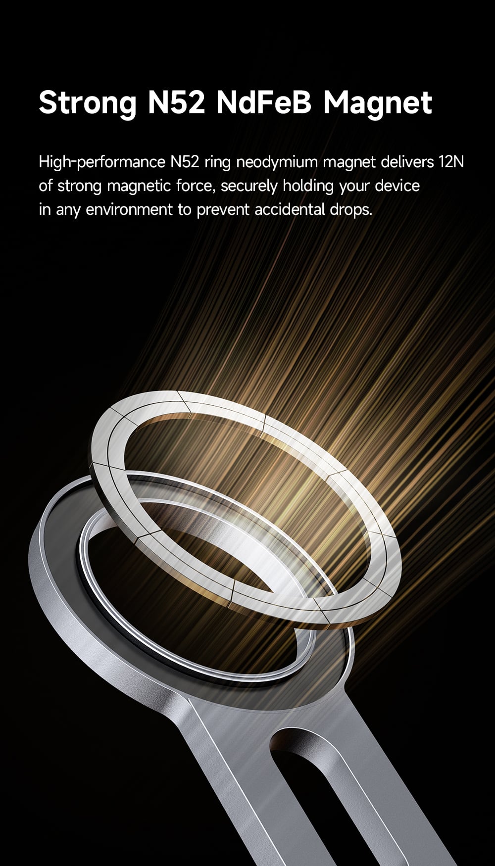 Điểm nổi bật của TB-621 là sử dụng nam châm N52 NdFeB – loại nam châm vĩnh cửu có từ lực rất cao, thường được dùng trong các phụ kiện từ tính cao cấp. Nhờ đó, đế có thể giữ chặt điện thoại hỗ trợ từ tính (hoặc dùng kèm vòng/ốp từ) mà không bị trượt rơi khi chạm, vuốt hay xoay ngang màn hình. Lực hút mạnh nhưng vẫn được thiết kế tối ưu để tháo máy ra dễ dàng bằng một tay, không gây cảm giác “dính chặt” quá mức, rất phù hợp khi cần nhấc máy nghe gọi nhanh.