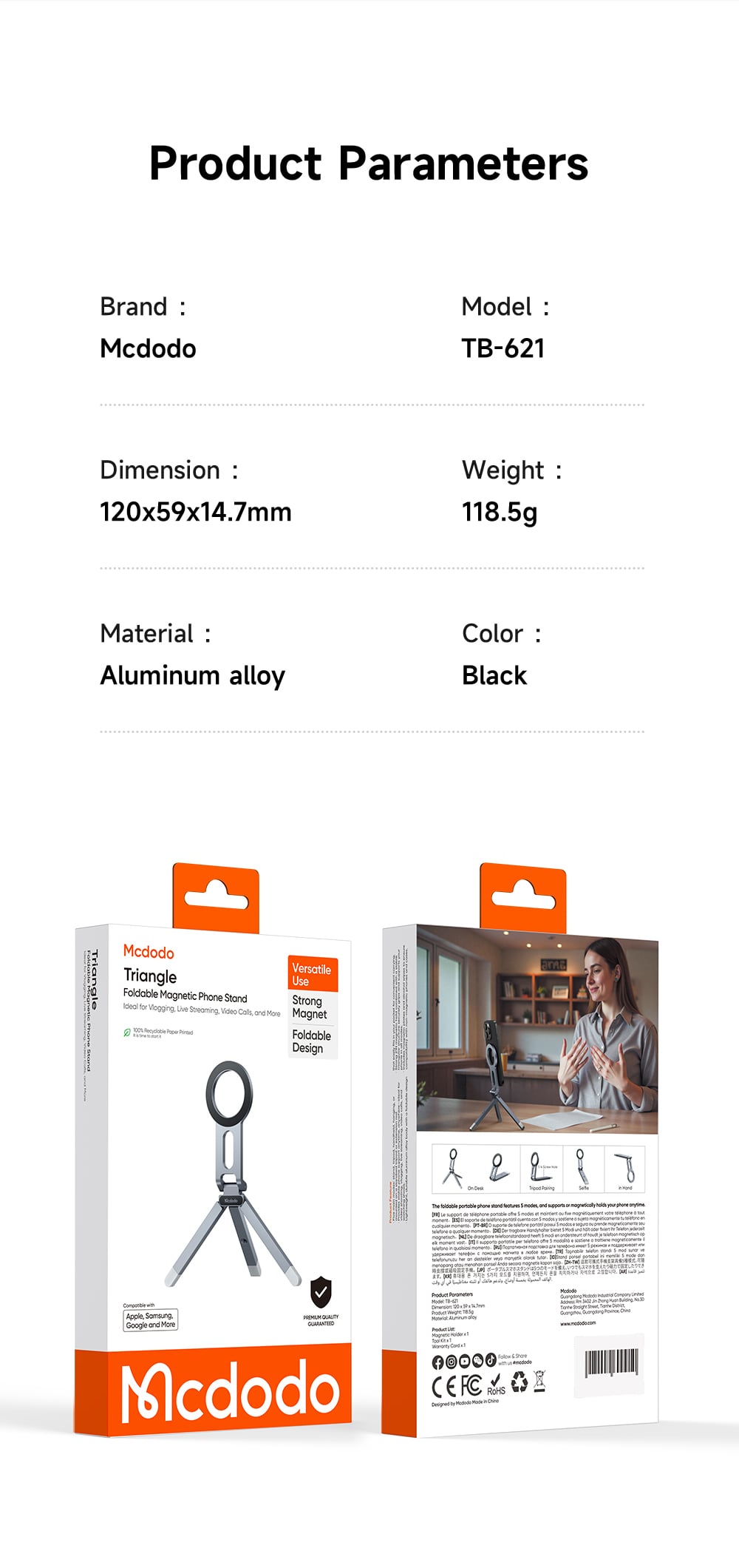 MCDODO TB-621 sở hữu thiết kế tối giản với các đường nét vuông vức, bề mặt phẳng hiện đại, dễ hòa hợp với nhiều phong cách bàn làm việc từ văn phòng đến home-office. Kích thước tổng thể nhỏ gọn giúp đế không chiếm nhiều diện tích, có thể đặt cạnh màn hình máy tính, cạnh laptop, trên kệ đầu giường hay góc bàn trang điểm. Chất liệu kim loại kết hợp nhựa cao cấp mang lại cảm giác cứng cáp, chắc chắn, đồng thời giữ được trọng lượng nhẹ để dễ dàng di chuyển.