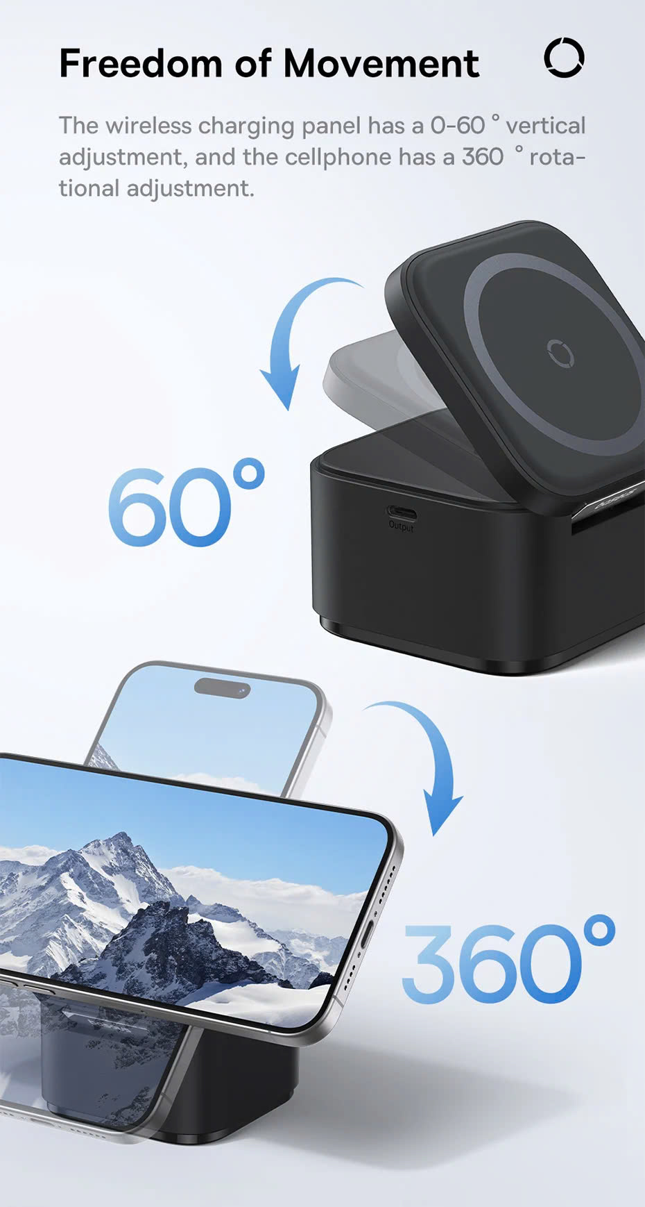 Với thiết kế 2-in-1, đế sạc Baseus MagPro có thể sạc hai thiết bị cùng lúc. Bạn có thể sạc iPhone và AirPods hoặc iPhone và điện thoại Android trên cùng một đế sạc, mang đến sự tiện lợi tối đa