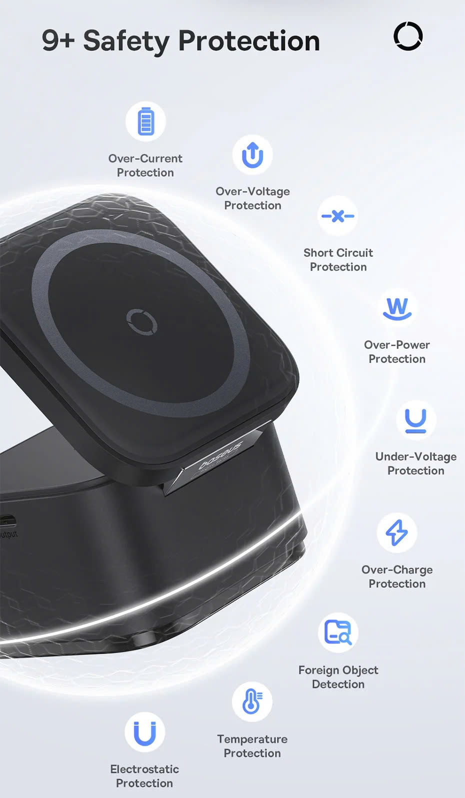 Baseus luôn chú trọng đến an toàn khi sạc, vì vậy MagPro 2-in-1 được trang bị nhiều lớp bảo vệ như: