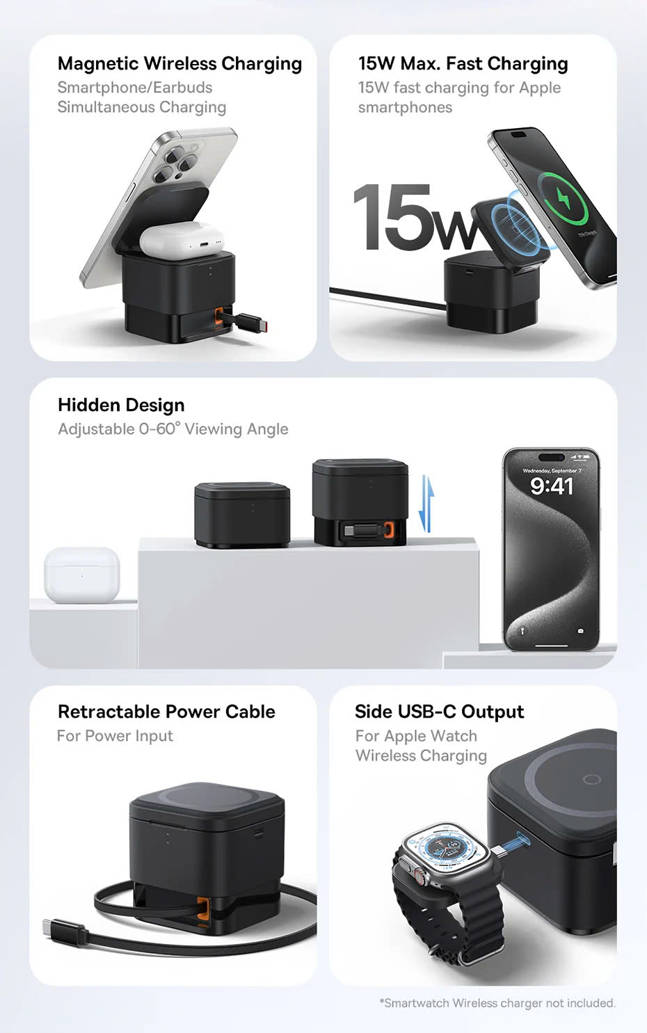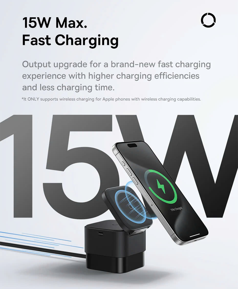 Sạc không dây 25W: iPhone 12/13/14/15 Series, điện thoại Android hỗ trợ Qi.