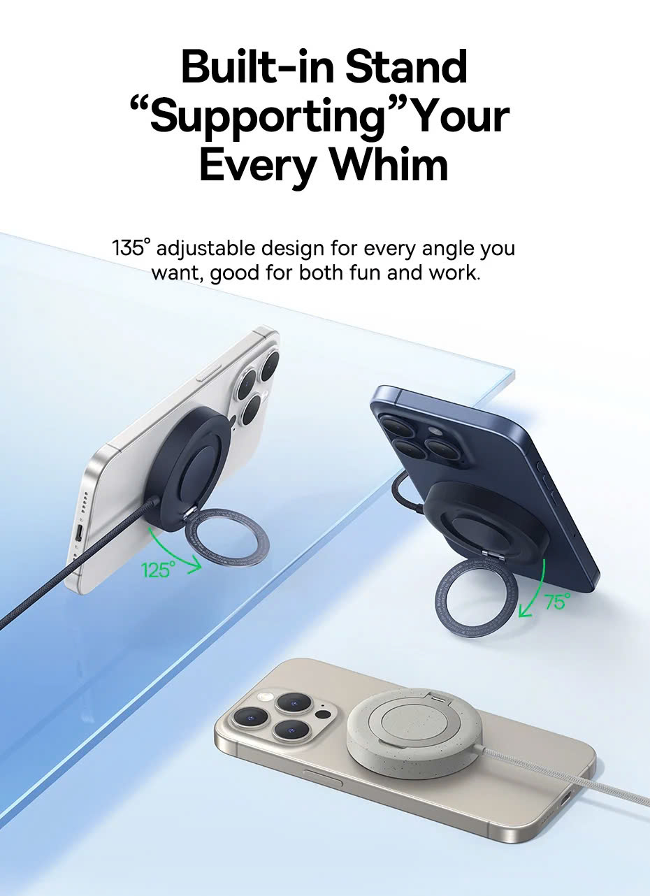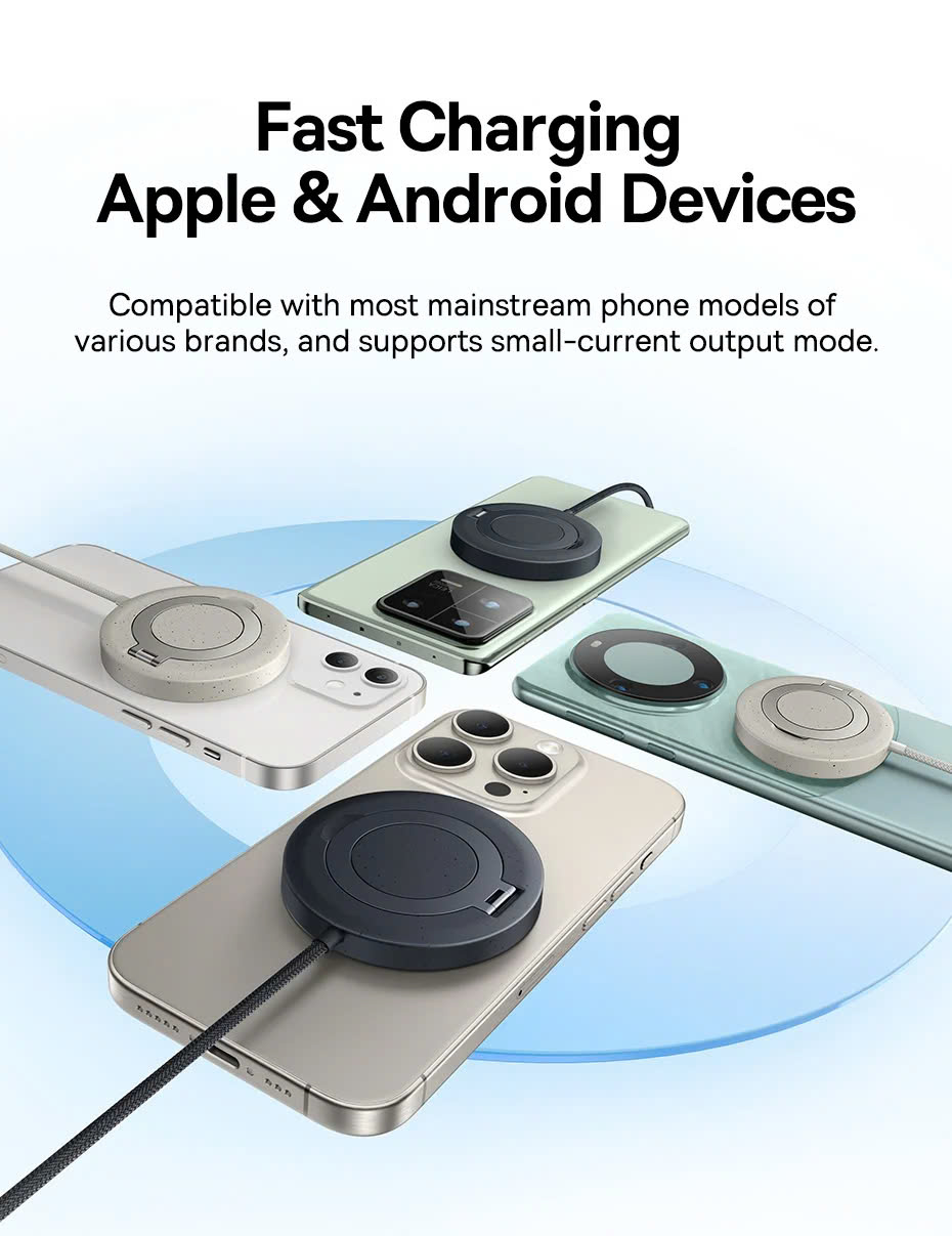 Đế sạc này hỗ trợ Magsafe, giúp iPhone 12 trở lên có thể kết nối từ tính dễ dàng với đế sạc mà không cần điều chỉnh vị trí thủ công. Lực hút mạnh mẽ đảm bảo quá trình sạc ổn định, không bị gián đoạn ngay cả khi bạn di chuyển nhẹ thiết bị.