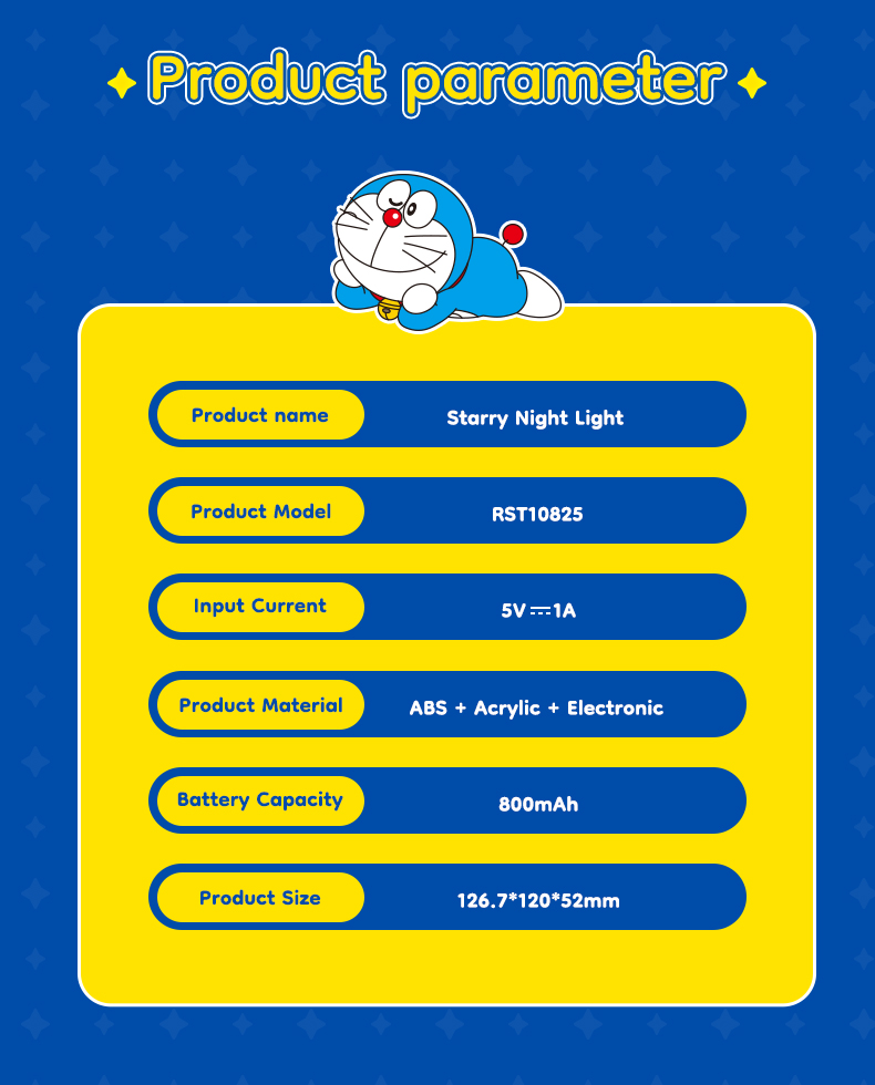 Đèn ngủ ROCK Doraemon Starry được làm từ chất liệu nhựa ABS cao cấp, chịu lực tốt và chống cháy nổ, đảm bảo an toàn tối đa khi sử dụng. Chất liệu này không chỉ bền bỉ mà còn thân thiện với môi trường, không gây hại cho sức khỏe người dùng.