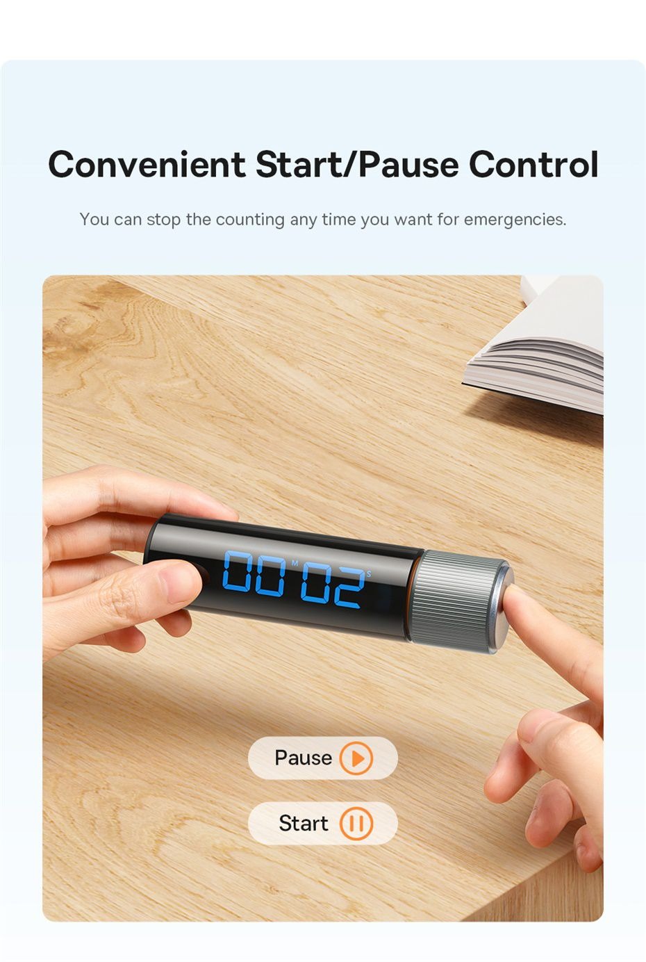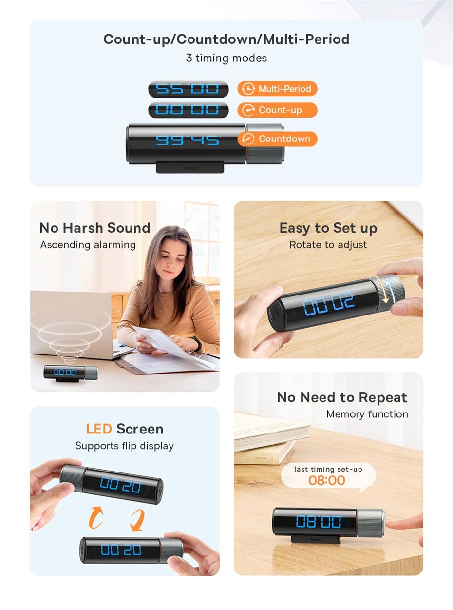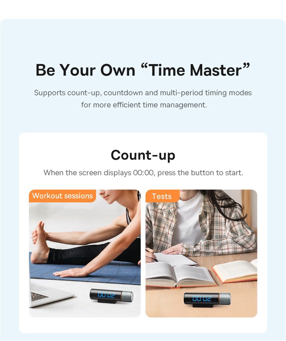Baseus Heyo có khả năng hẹn giờ với độ chính xác tới từng giây. Thiết kế màn hình kỹ thuật số, góc nhìn rộng để bạn có thể dễ dàng theo dõi thời gian cho dù bạn ở vị trí nào.