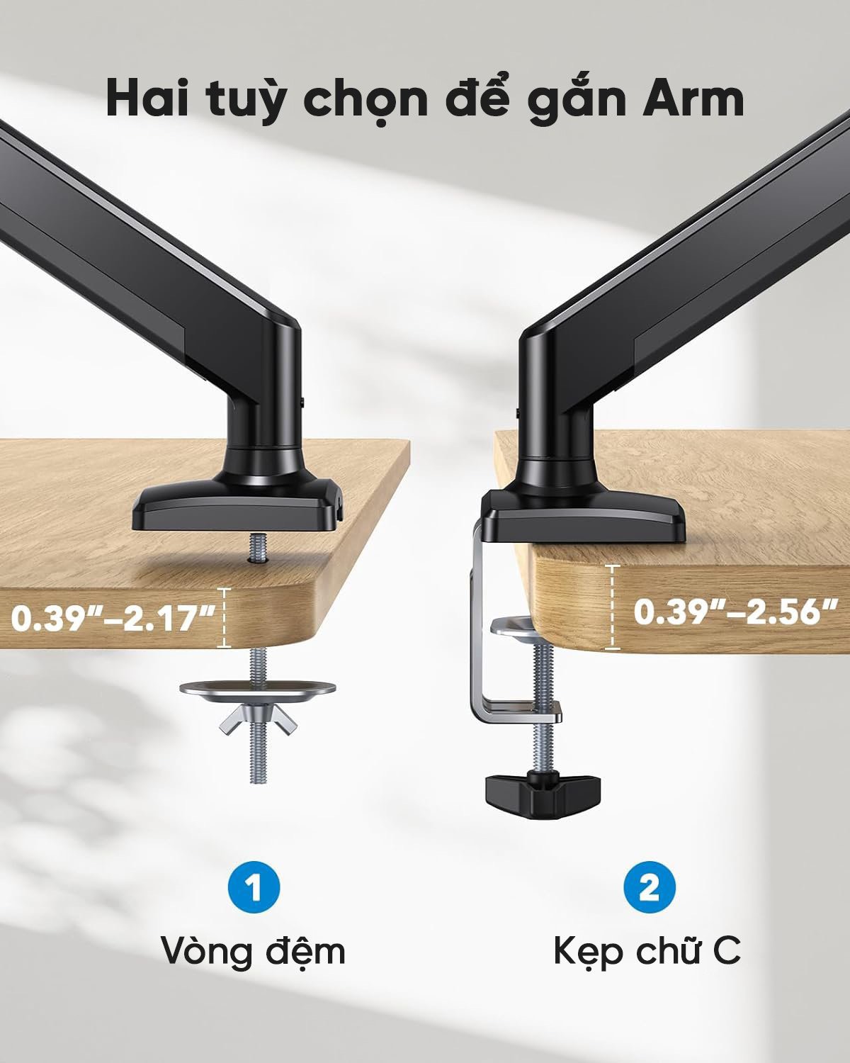 Chỉ bằng một tay, bạn có thể nâng hoặc hạ độ cao màn hình trong khoảng từ 10cm đến 50cm, thích ứng với mọi tư thế làm việc, ngồi hoặc đứng. Gas Spring đảm bảo chuyển động nhẹ nhàng, ổn định, không cần dùng lực lớn.