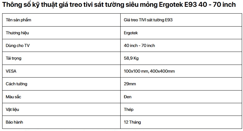 Ergotek E93 là mẫu giá treo tivi treo sát tường siêu mỏng, thiết kế gọn nhẹ chỉ 2,9 mm, phù hợp với màn hình từ 40" đến 70", chịu tải tối đa đến 58,9 kg Shopee+11Giá Trị Rẻ+11Giá Trị Rẻ+11. Sản phẩm tương thích chuẩn VESA 100×100 mm đến 600×400 mm, giúp dễ dàng lắp đặt cho các mẫu TV phổ biến hiện nay Giá Trị Rẻ+3Sản Phẩm Công Nghiệp+3Điện Máy Toàn Linh+3.