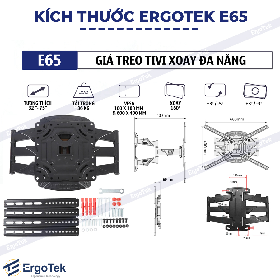 Ergotek E65 là giá treo TV / màn hình đa năng, phù hợp cho tivi hoặc màn hình phẳng kích thước từ 32 đến 75 inch. Nếu bạn muốn một giải pháp linh hoạt để gắn TV — có thể xoay, nghiêng và dễ dàng điều chỉnh góc nhìn — E65 là lựa chọn lý tưởng cho phòng khách, phòng ngủ, văn phòng, quán cafe, showroom hoặc phòng họp.