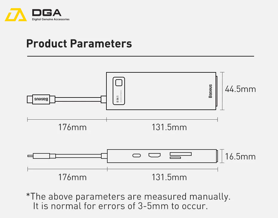 Name: Baseus Metal Gleam Series 7-in-1 Multifunctional Type-C HUB Docking Station Model No.: BS-OH043 Output port: USB 3.0*3: 5Gbps (Max.) HDMI: 4K@30Hz (Max.) VGA: 1920*1080P@60Hz Type-C PD: 100W (Max.) RJ45: 1000Mbps (Max.) Input: 5V/3A, 9V/3A, 15V/3A, 20V/5A Output: 5V/0.9A Operating systems: Windows, Apple OS, Linux, Vista |