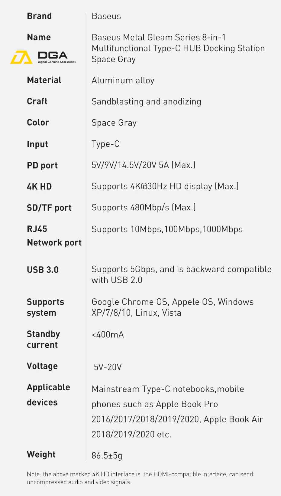 Name: Baseus Metal Gleam Series 8-in-1 Multifunctional Type-C HUB Docking Station Model No.: BS-OH046 Output port: USB 3.0*3: 5Gbps (Max.) HDMI*2: 4K@30Hz (Max.) SD/TF: 104MB/s Type-C PD: 100W (Max.) Input: 5V/3A, 9V/3A, 15V/3A, 20V/5A Output: 5V/0.9A Operating systems: Windows, Apple OS, Linux, Vista |