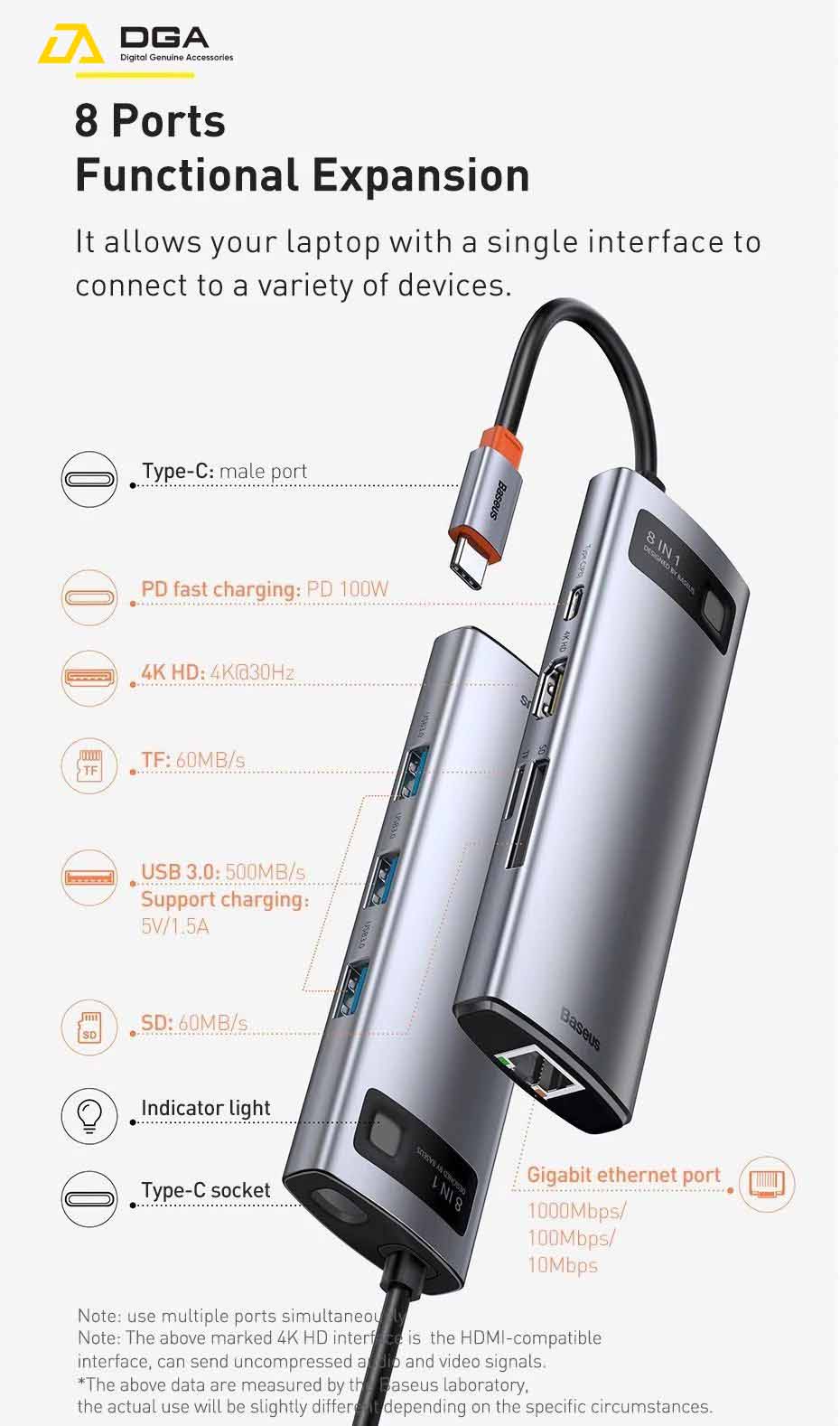 Name: Baseus Metal Gleam Series 8-in-1 Multifunctional Type-C HUB Docking Station Model No.: BS-OH045 Output port: USB 3.0*3: 5Gbps (Max.) HDMI: 4K@30Hz (Max.) VGA: 1920*1080P@60Hz SD/TF: 104MB/s Type-C PD: 100W (Max.) Input: 5V/3A, 9V/3A, 15V/3A, 20V/5A Output: 5V/0.9A Operating systems: Windows, Apple OS, Linux, Vista |