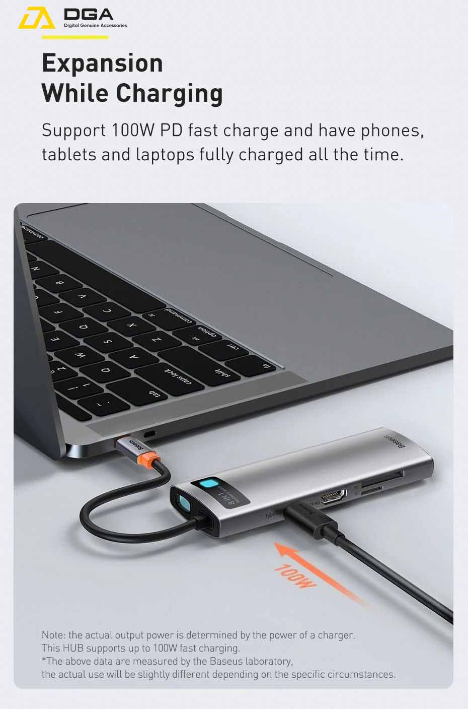 - Hub chuyển đổi Baseus Metal Gleam hỗ trợ giao thức sạc nhanh PD 100W giúp cho điện thoại, máy tính bảng và máy tính xách tay luôn được sạc đầy. Hub Chuyển đổi Baseus chất liệu hộp kim nhôm cho khả năng chống ăn mòn cực tốt chịu được nhiệt độ cao và tính dẫn điện của nhôm chỉ bằng 2/3 của kim loại đảm bảo an toàn cho thiết bị mà không lo giật điện , cháy nổ.
