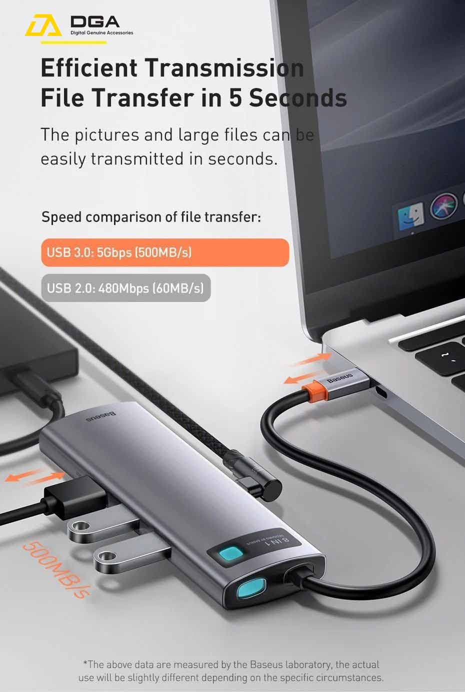 - Hub Chuyển đổi Baseus có tốc độ truyền dữ liệu USB 3.0 lên đến 5Gbps, hình ảnh và các tệp lớn có thể dễ dàng được truyền trong vài giây và không bị giật, rớt kết nối giữa chừng giúp làm việc hiệu quả hơn.